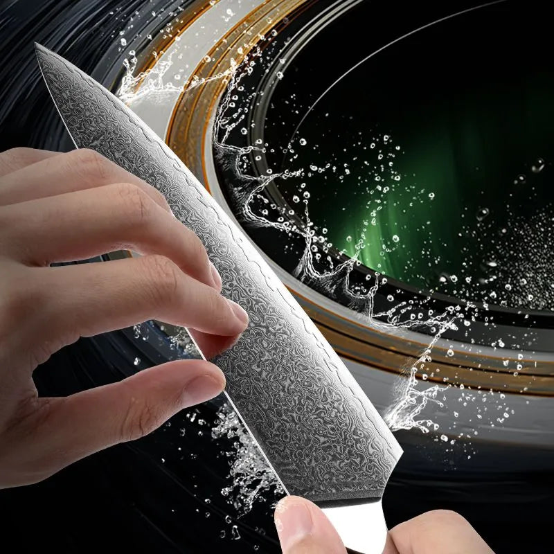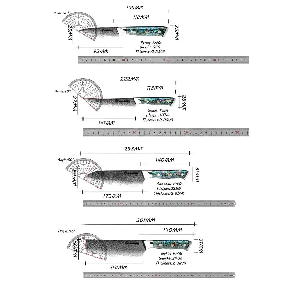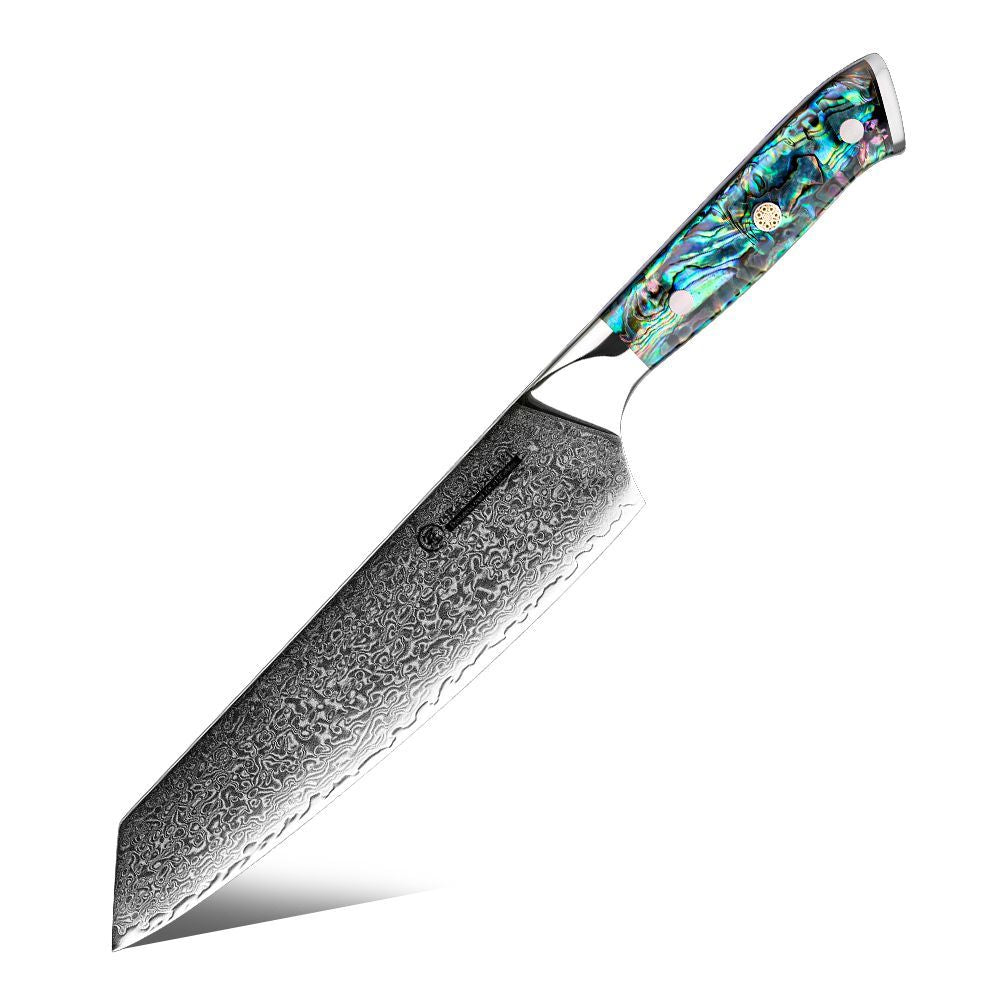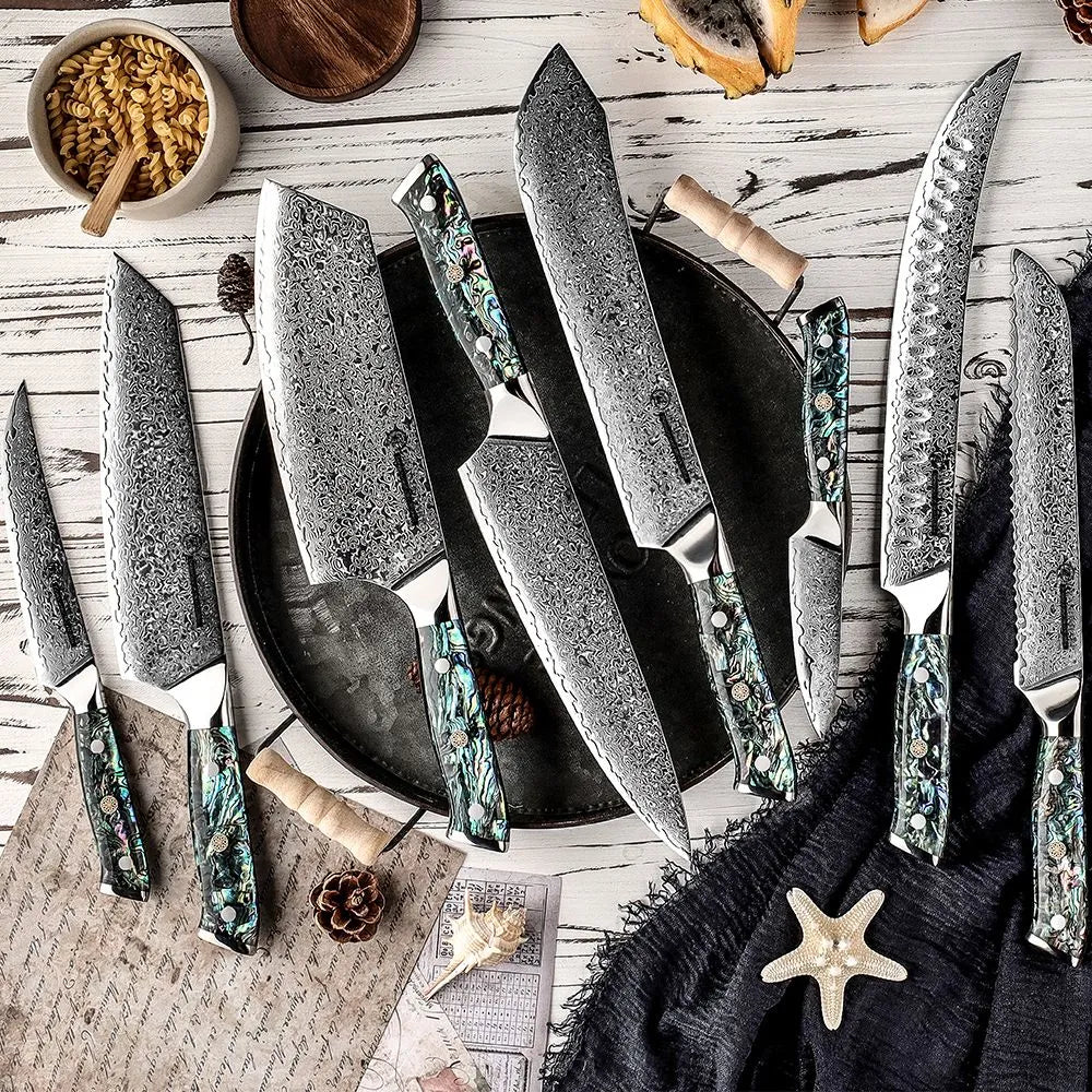 This premium Damascus steel knife set features 67 layers of high-carbon steel for exceptional sharpness and durability. The ergonomic abalone shell handle provides comfortable grip while cutting fruits, vegetables, and meats. Perfect for both professional chefs and home cooking enthusiasts.
