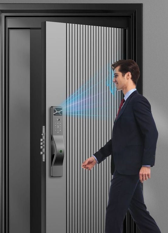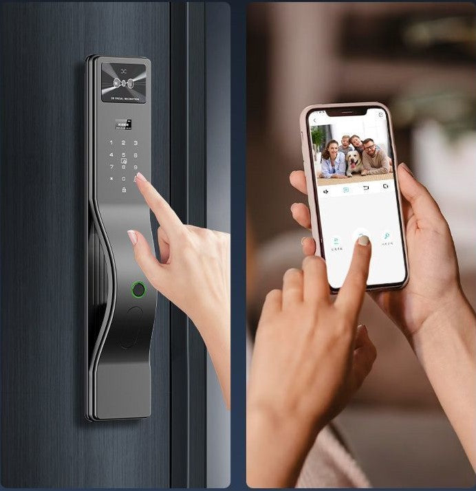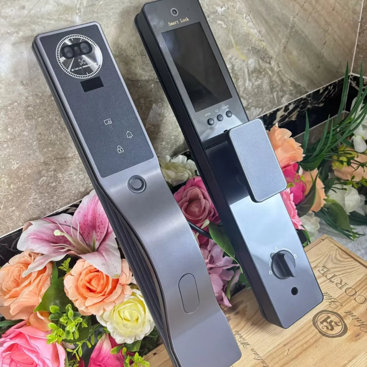 Advanced biometric smart lock featuring 3D facial recognition and palm vein technology with 4.5 inch display. Multiple unlock methods include fingerprint, IC card, password, facial recognition, and remote app control. Equipped with 24-hour monitoring, two-way video intercom, and Class C security cylinder for maximum protection.