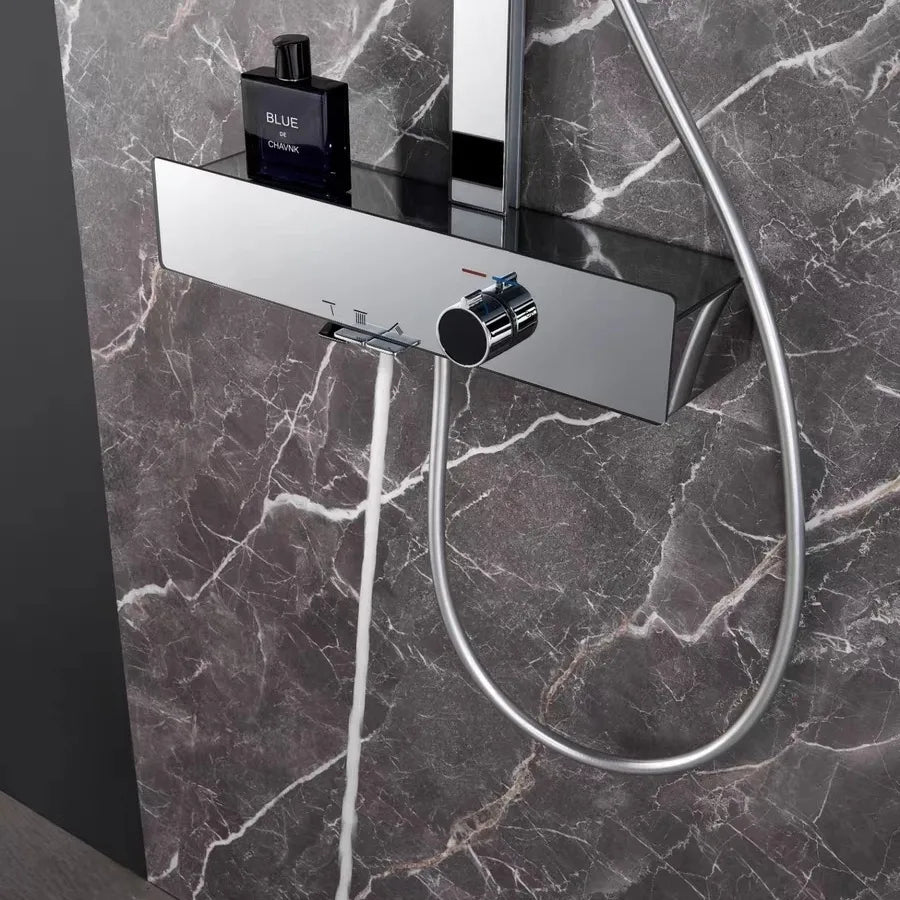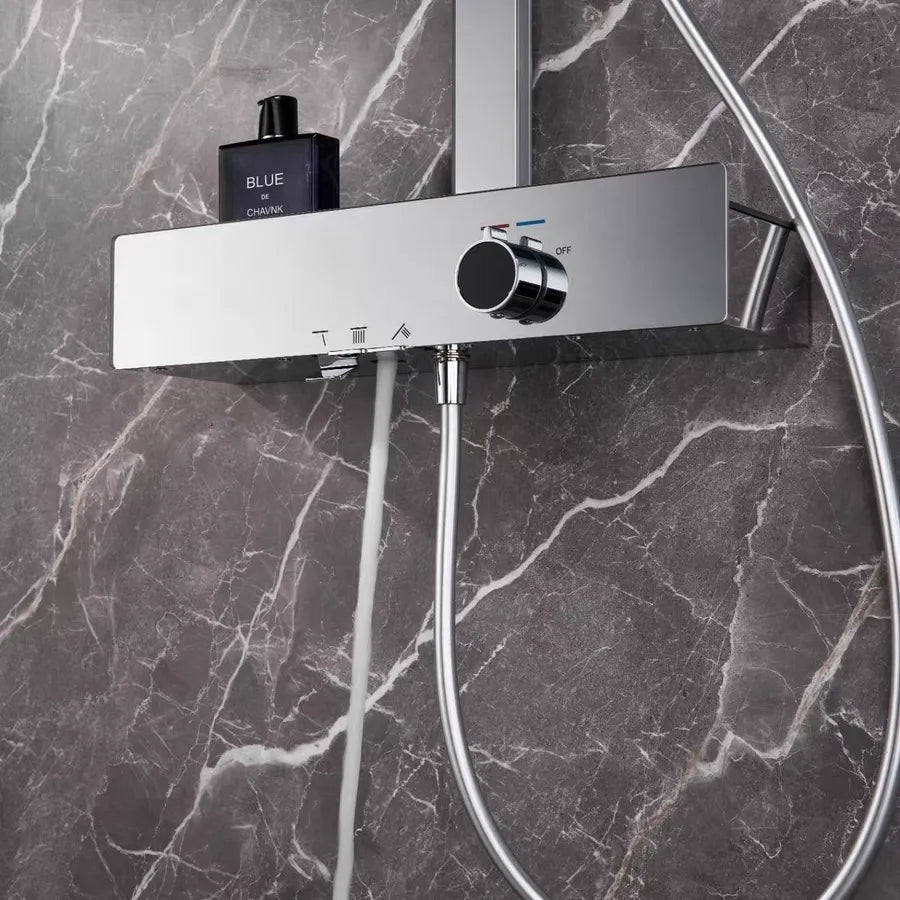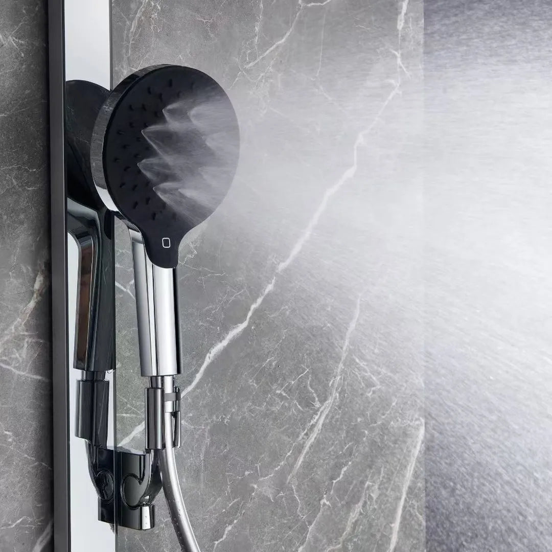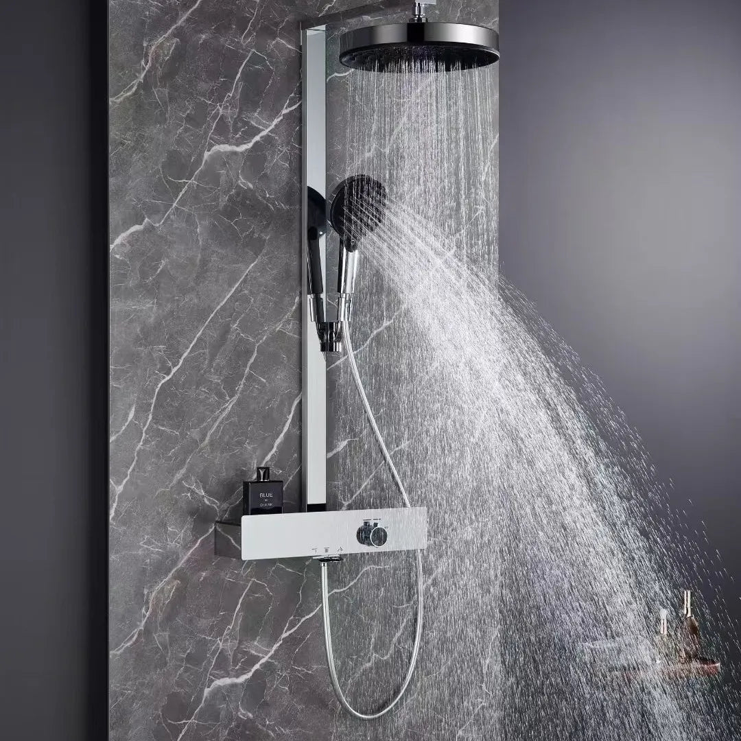 Premium all-copper shower head system featuring brass H59 main waterway with chrome plating finish. Single-handle dual control design with boost feature for pressurized water flow and enhanced shower performance. Wall-mounted installation with fixed and rotatable bracket for flexible setup and easy maintenance.