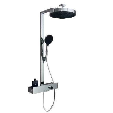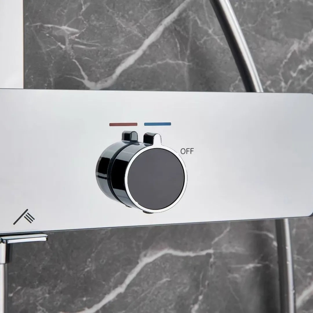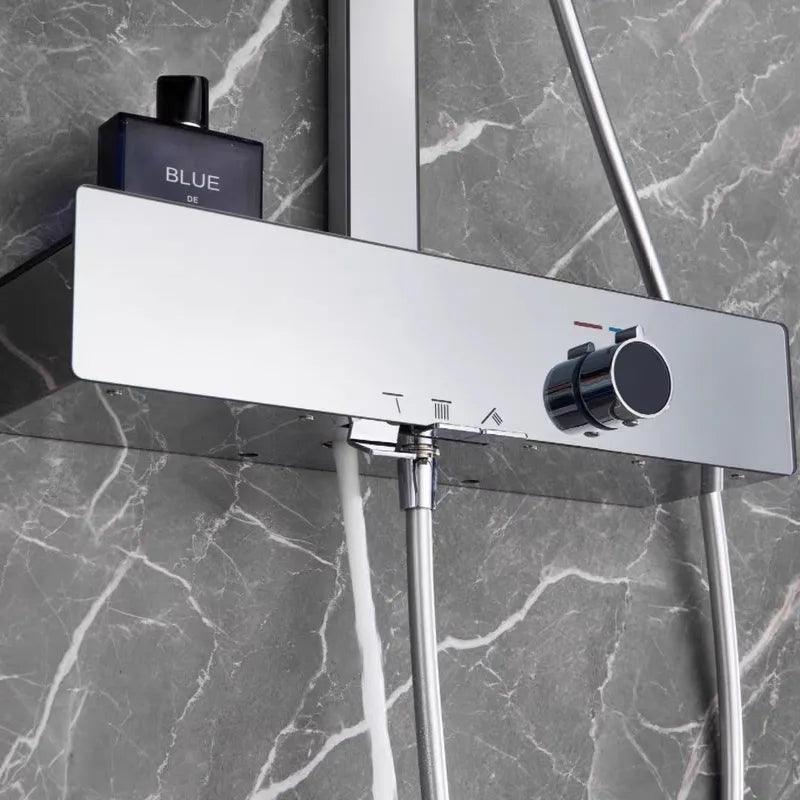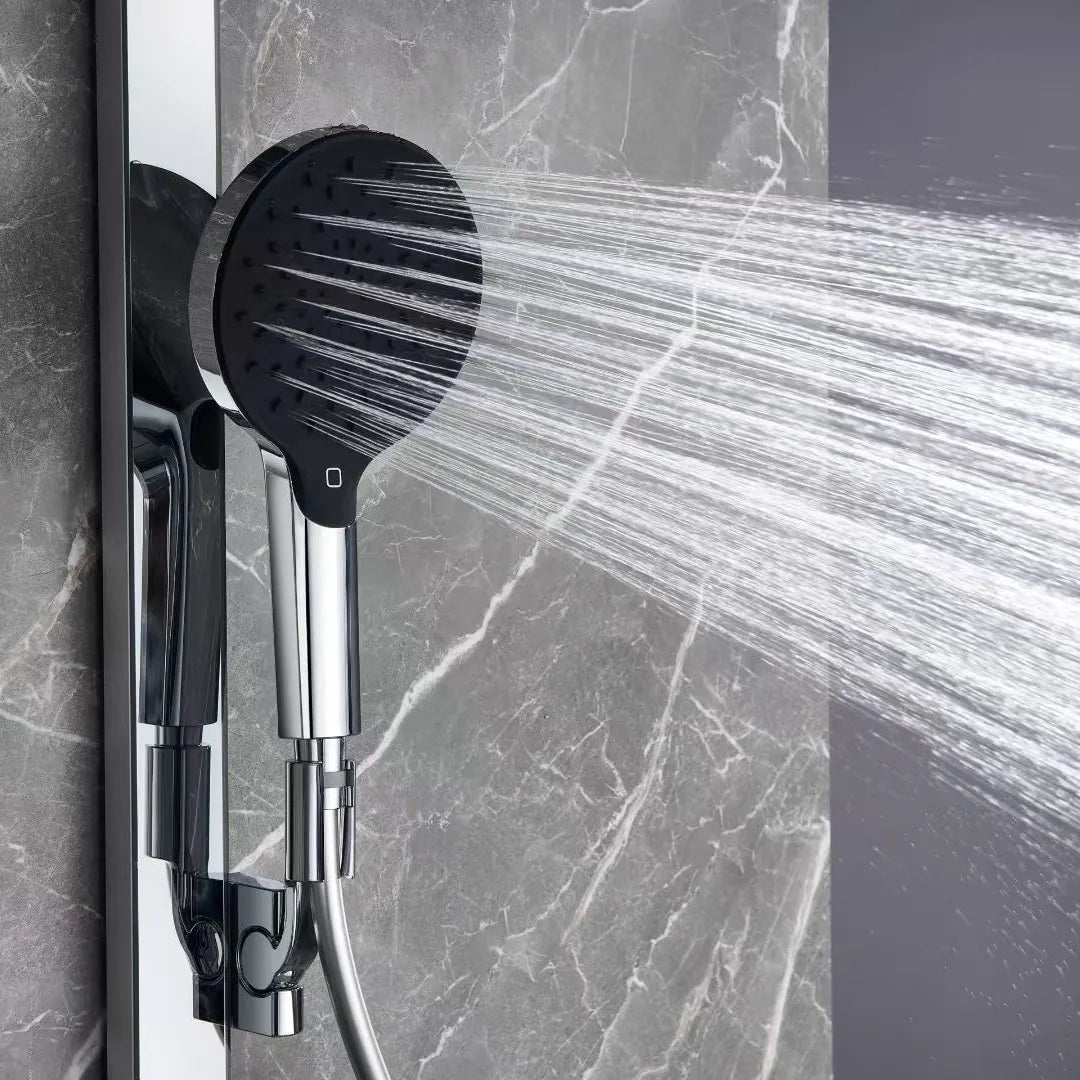 Premium all-copper shower head system featuring brass H59 main waterway with chrome plating finish. Single-handle dual control design with boost feature for pressurized water flow and enhanced shower performance. Wall-mounted installation with fixed and rotatable bracket for flexible setup and easy maintenance.