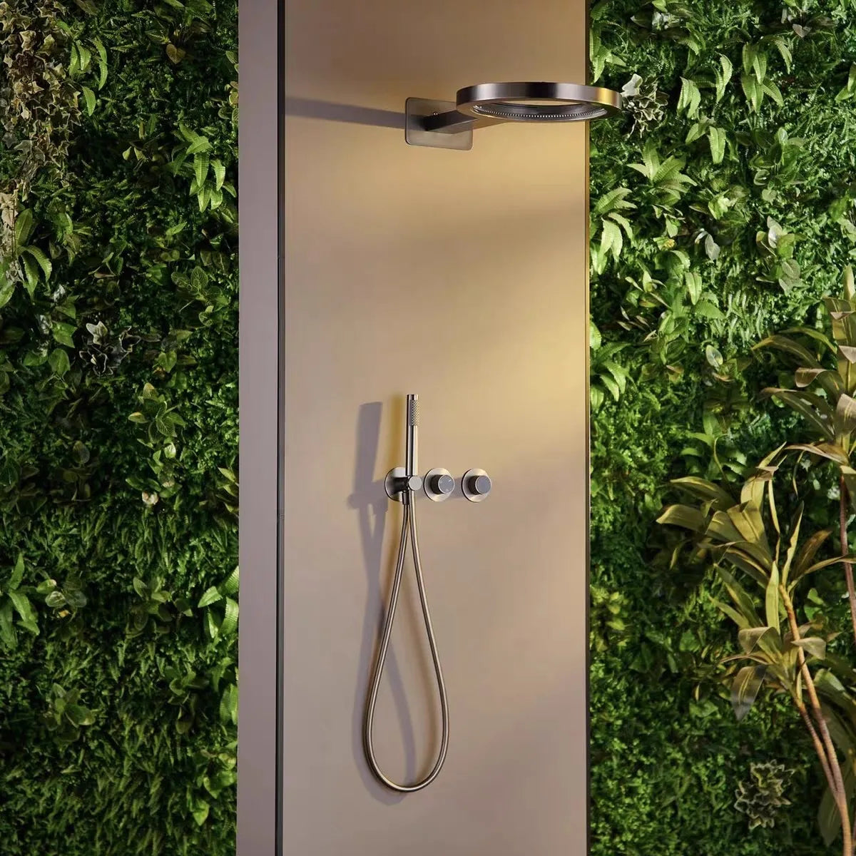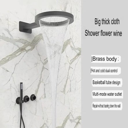 Premium wall-mounted concealed shower system with brushed finish and single-handle dual control design. Features boost function for pressurized water flow with fixed and rotatable bracket installation. Minimalist style with double shower faucet combining functionality and elegant bathroom aesthetics.