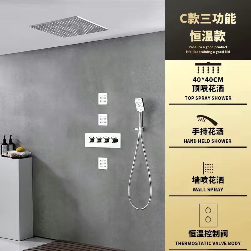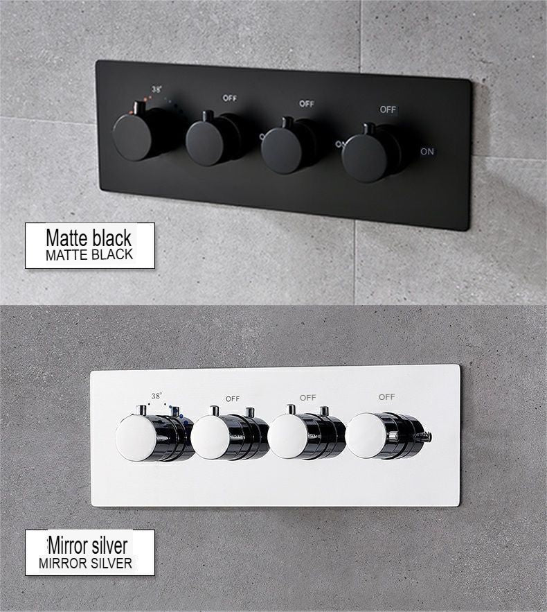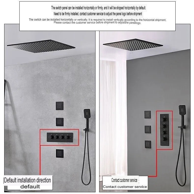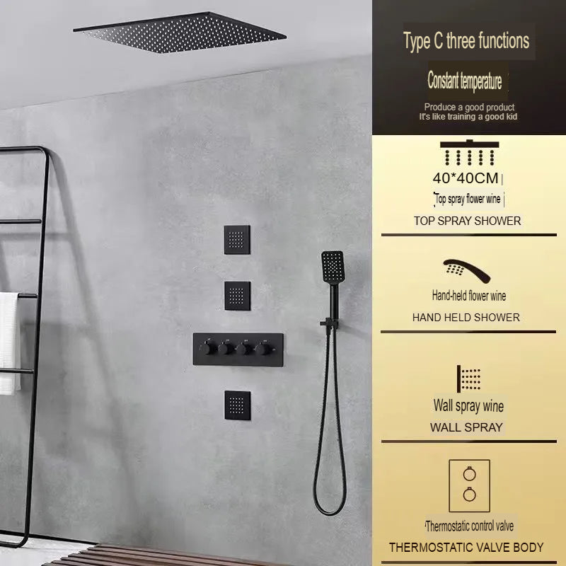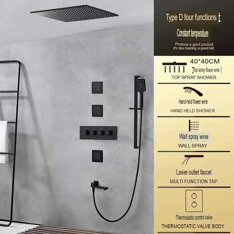 Premium black all-copper concealed shower system with constant temperature control and built-in filter technology. Features rotatable pressurized spray with canopy shower screen and ceiling-mounted thermostatic faucet design. Double shower faucet with rotatable lifting bracket offers flexible installation and superior water performance.