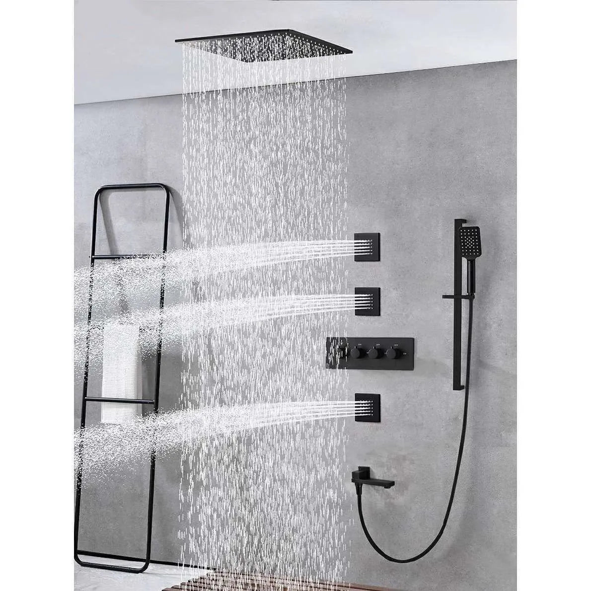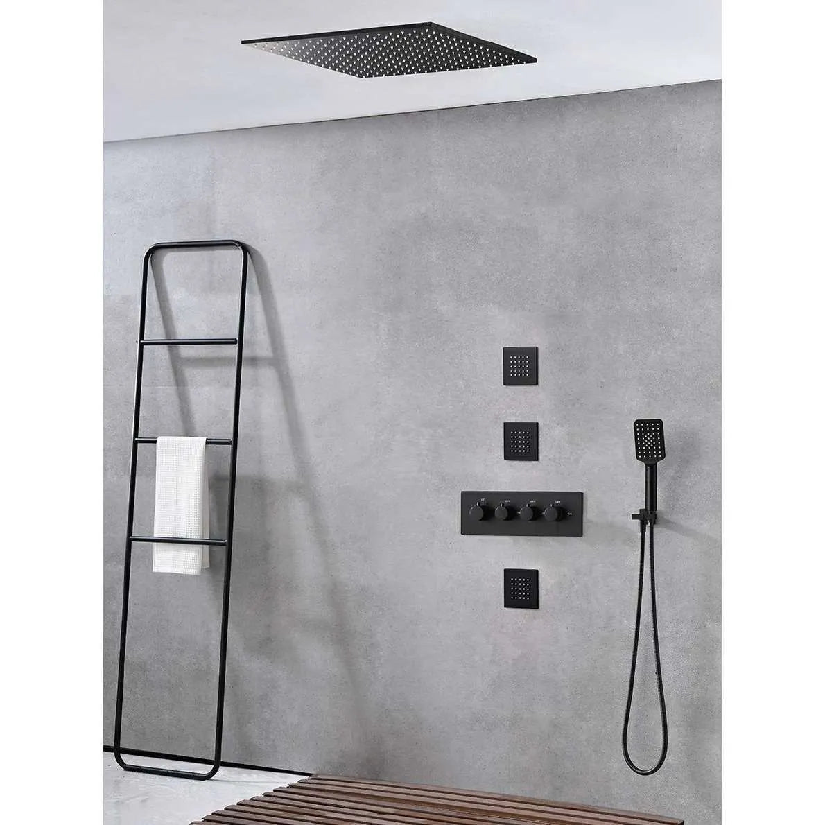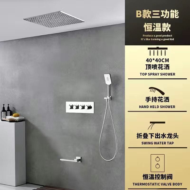 Premium black all-copper concealed shower system with constant temperature control and built-in filter technology. Features rotatable pressurized spray with canopy shower screen and ceiling-mounted thermostatic faucet design. Double shower faucet with rotatable lifting bracket offers flexible installation and superior water performance.