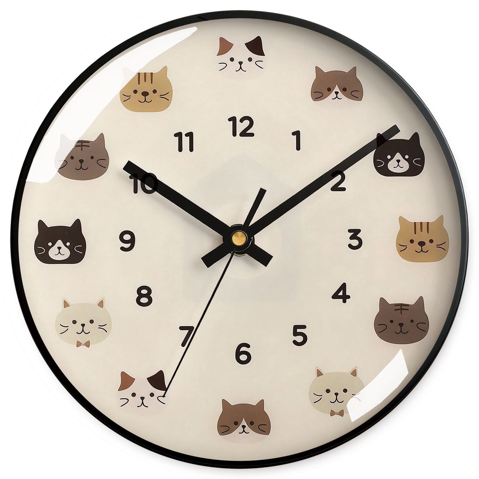 Adorable cartoon cat minimalist wall clock with silent quartz movement. Perfect for modern living rooms and bedrooms seeking creative home decor. Features durable plastic casing, glass mirror, and paper laminated dial. Battery-operated design with smooth pointer display ensures quiet, reliable timekeeping for any space.