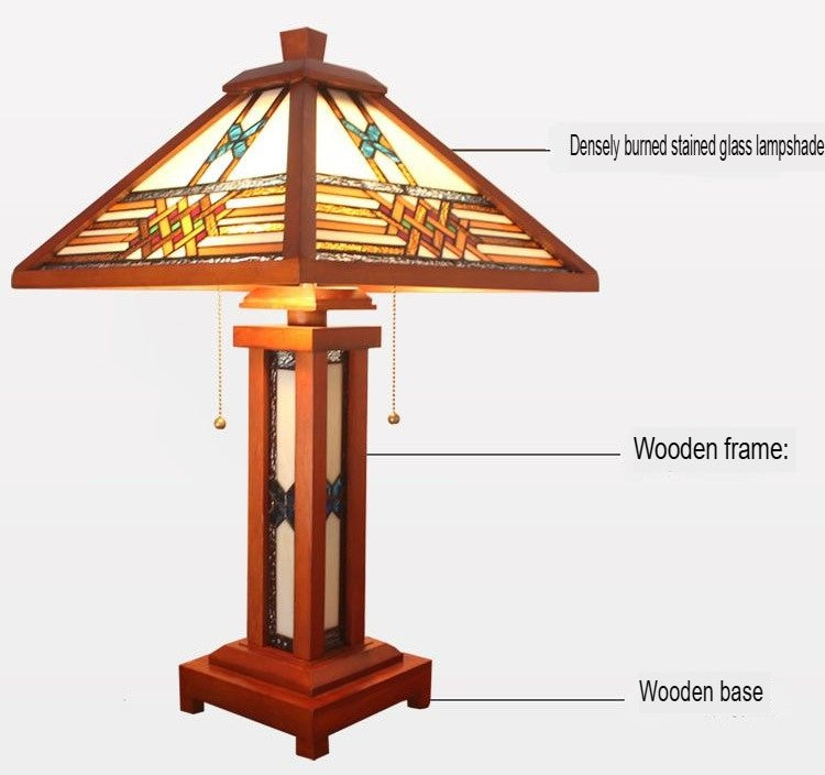 This exquisite handcrafted table lamp features colorful stained glass shade with geometric patterns. The solid wood base and frame provide stable construction with traditional Chinese craftsmanship. Dual pull-chain switches control two internal bulbs for adjustable lighting perfect for bedrooms and living rooms.
