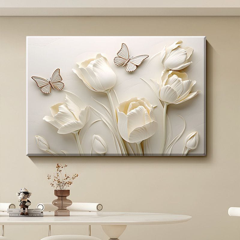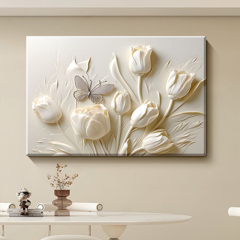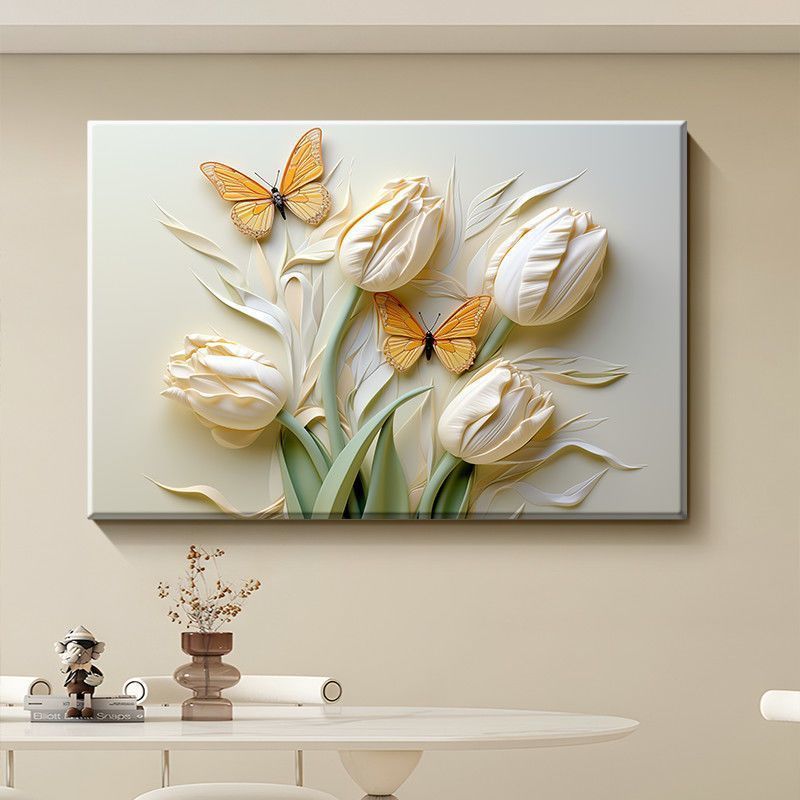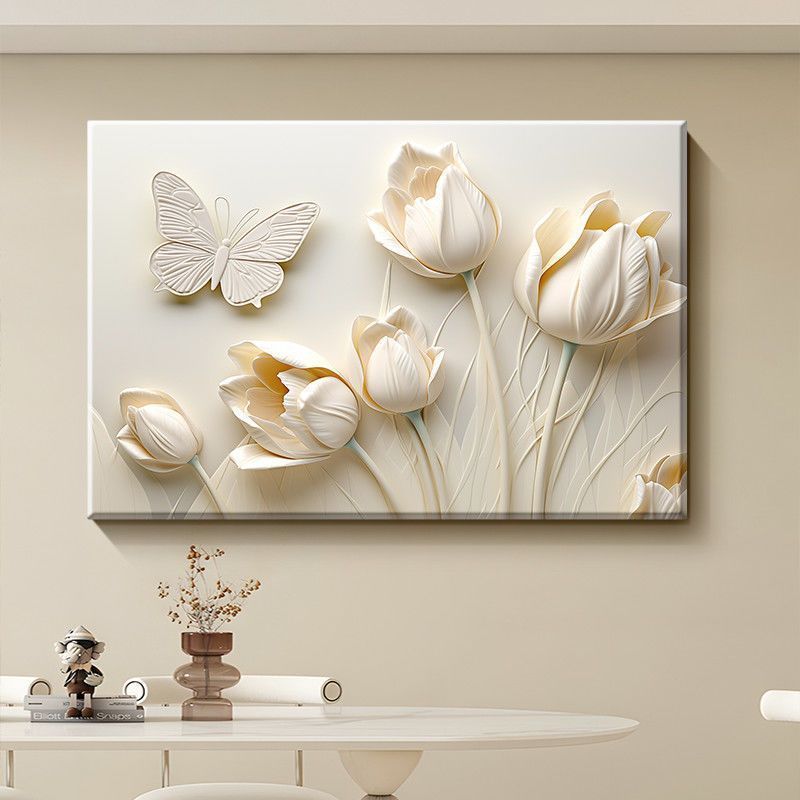Transform your living room with this elegant cream-toned tulip and butterfly mural. Spray-painted natural scenery on premium cloth grain film creates a sophisticated focal point perfect for sofa backgrounds and high-end interiors. This creamy floral artwork brings timeless botanical beauty and restaurant-quality elegance to any space.