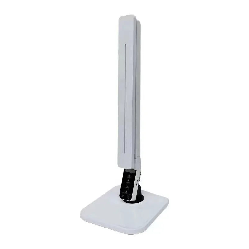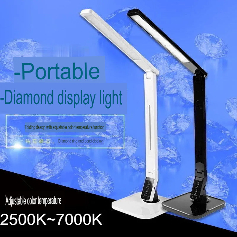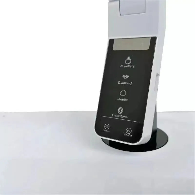 Professional gemstone identification lamp features four specialized color temperature modes for diamond, jewelry, jadeite, and gemstone appraisal. Adjustable color temperature from 2500K-7000K provides accurate color rendering for precise gem evaluation. Foldable design with touch control panel includes 60-minute timer and brightness adjustment for professional use.