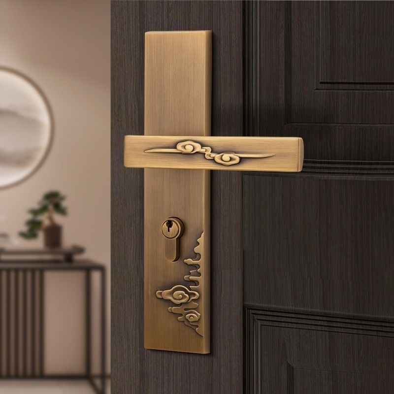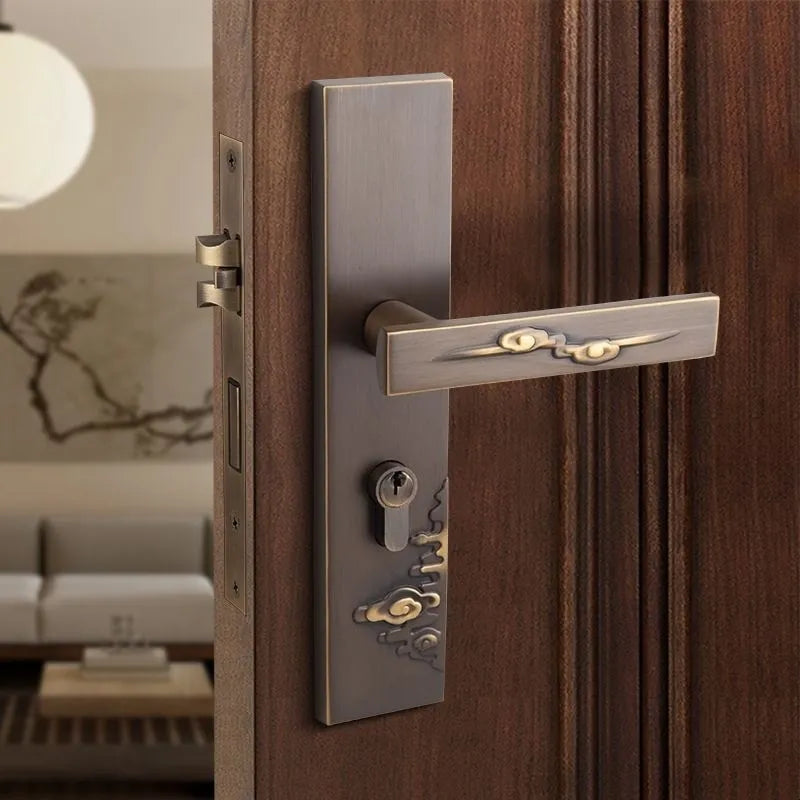 Premium all-copper construction door lock featuring double locking tongue mechanism for enhanced bedroom security. Silent operation with Grade A cylinder and antique-inspired plated finish for wooden doors. Suitable for bathroom and bedroom applications with 58mm center distance for universal compatibility.