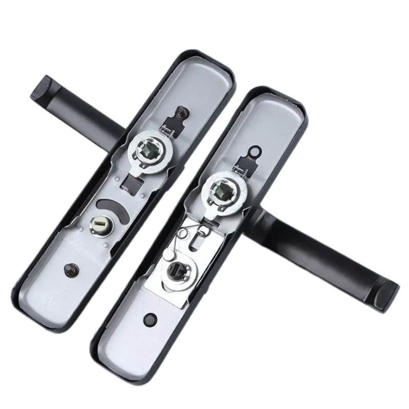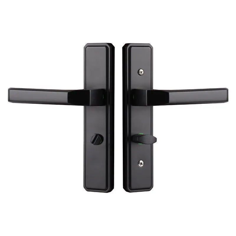 Modern bathroom door lock featuring sleek black finish and oblique tongue mechanism. Perfect for glass doors requiring reliable security with contemporary style. Easy installation with 50mm center distance for standard bathroom applications.