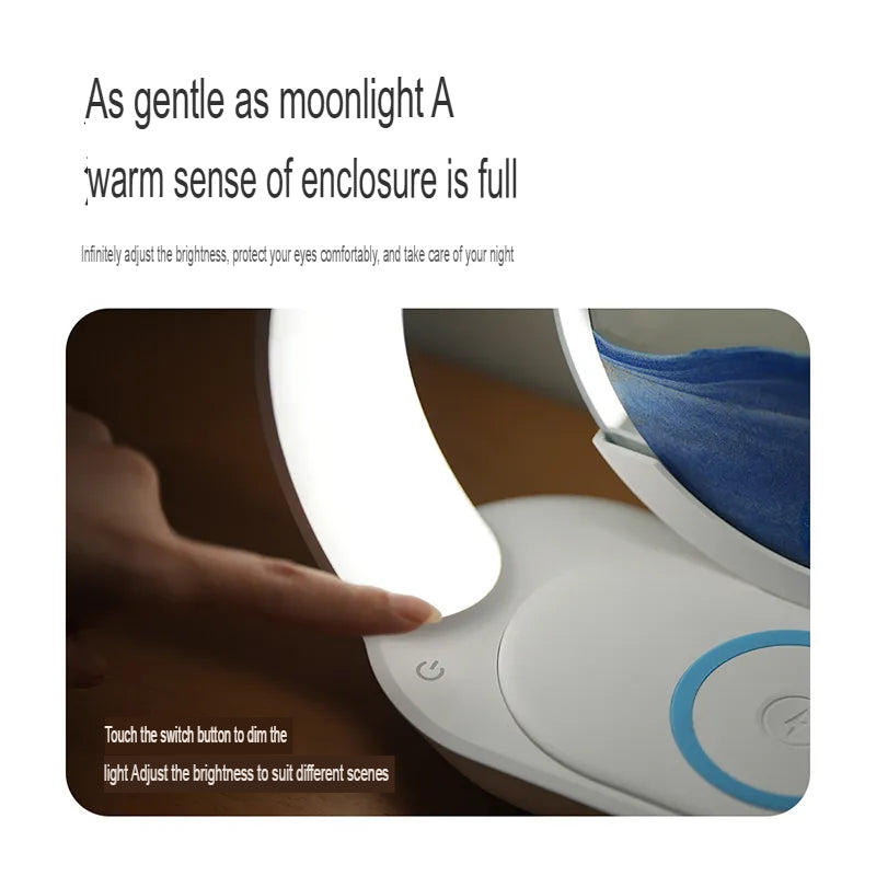 This innovative crescent-shaped lamp features mesmerizing flowing sand art displayed in a suspended circular frame. With built-in wireless charging capability and adjustable brightness, it combines artistic beauty with practical functionality. The rechargeable battery provides up to 34 hours of gentle illumination perfect for bedrooms and relaxation spaces.
