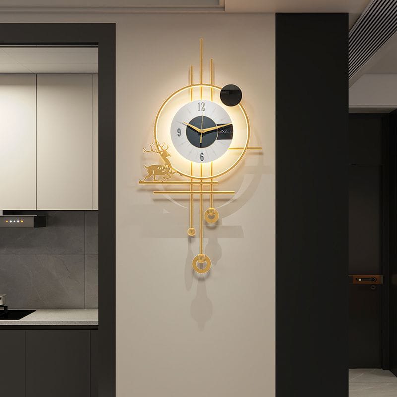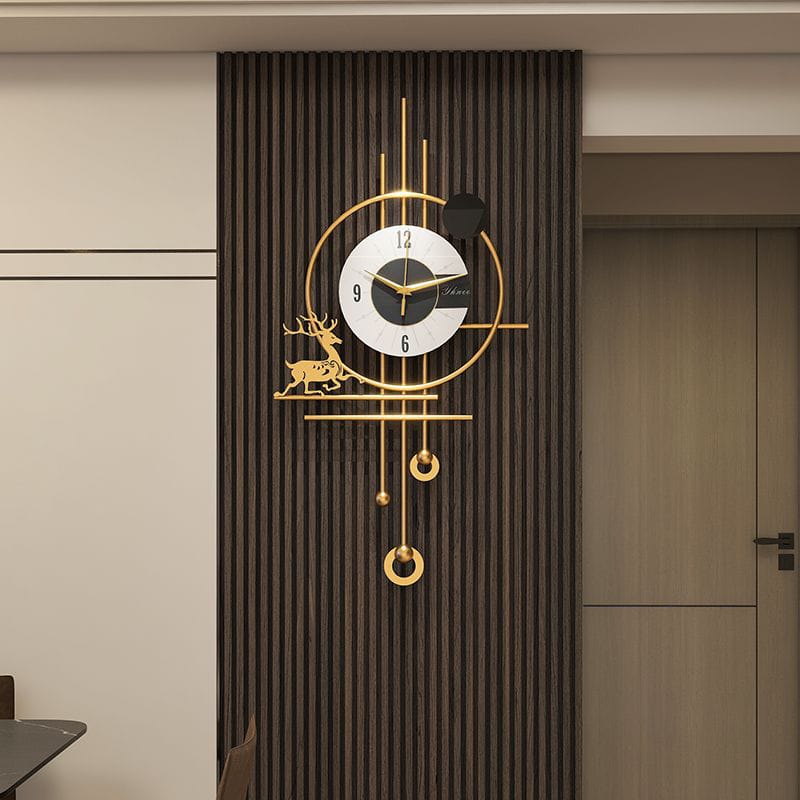 Light luxury grille wall clock combining gold metal with minimalist modern design. Silent quartz movement perfect for living rooms, kitchens, and offices. 2024 fashionable creative style features elegant round dial with digital display. Metal construction adds sophistication to any contemporary space. Battery-operated for convenient, quiet timekeeping without hassle.