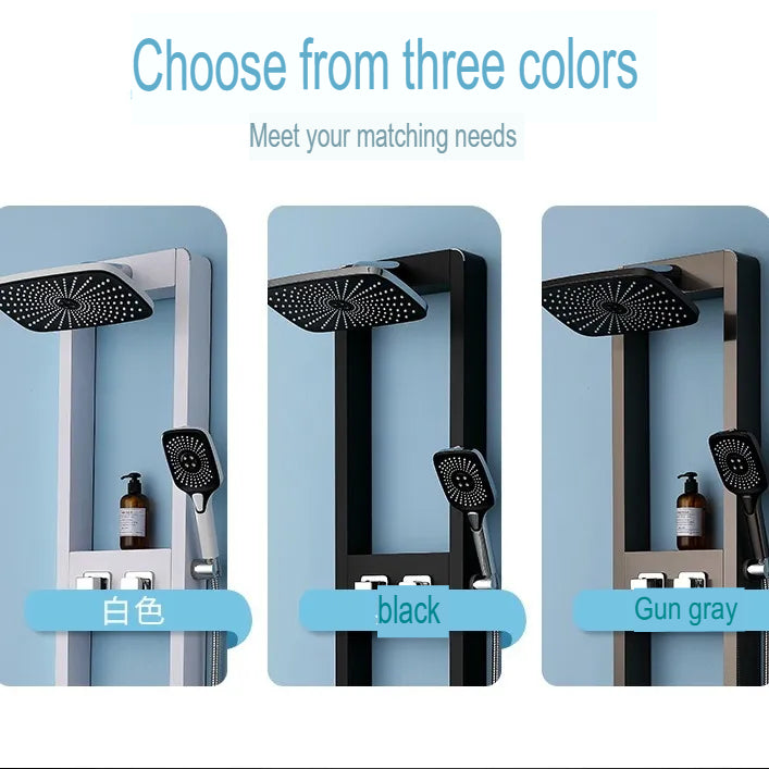 This premium gunmetal gray shower system features intelligent thermostatic control with digital display and pressurized water technology. Built with 304 stainless steel construction and ceramic valve core for durability and consistent temperature control. Includes detachable storage shelves, adjustable overhead spray with 278 water outlets, and water-powered LED display.