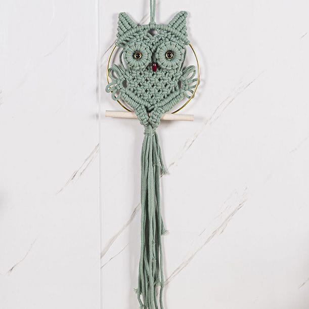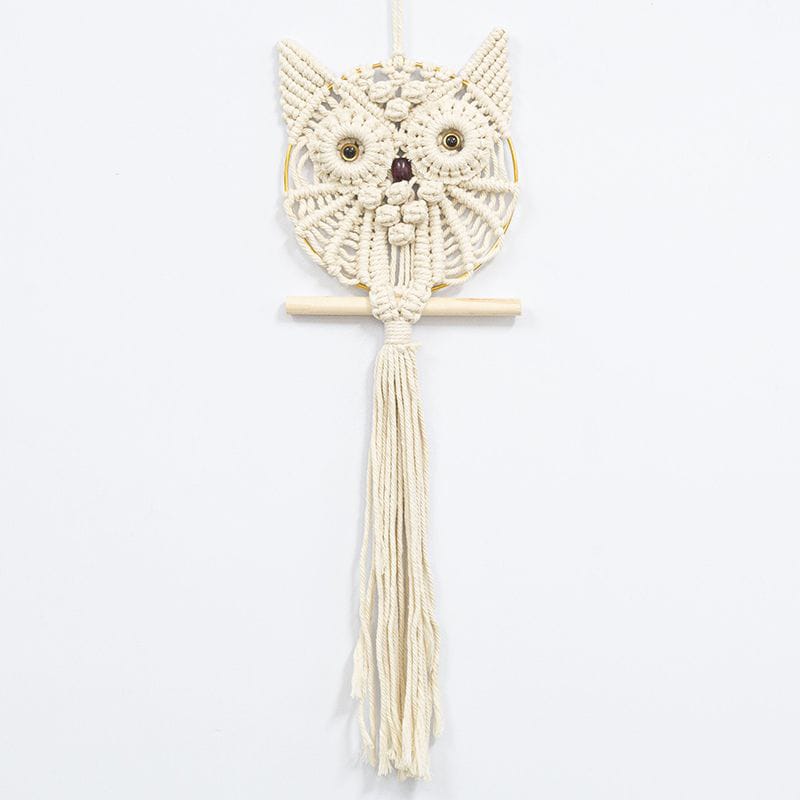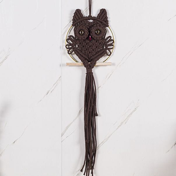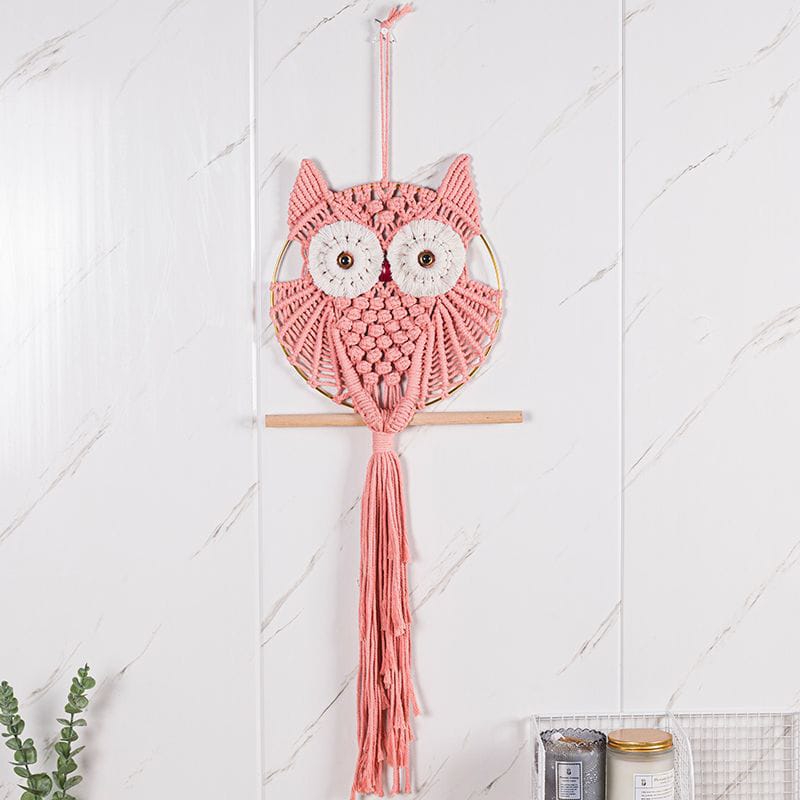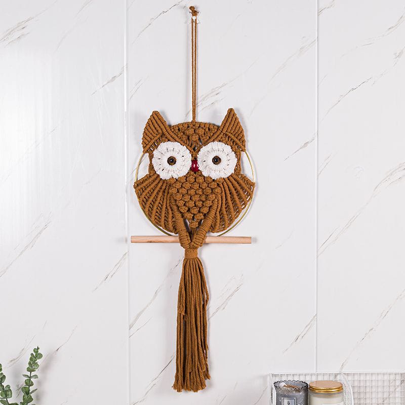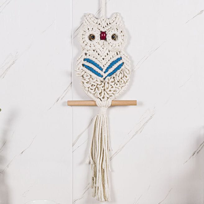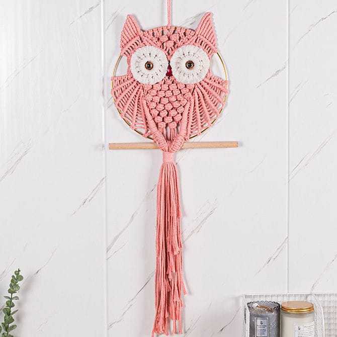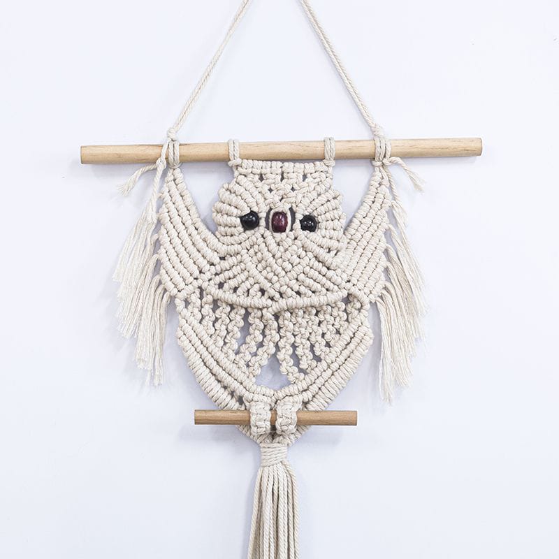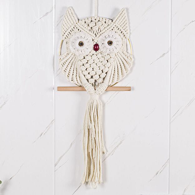 Charming handmade macrame wall hanging featuring adorable owl design in natural cotton. Perfect for Nordic and bohemian interiors. Hand-woven craftsmanship brings warmth to living rooms, bedrooms, and studies. Cream and beige tones complement any décor style. Eco-friendly, hand-washable material ensures durability and easy maintenance.