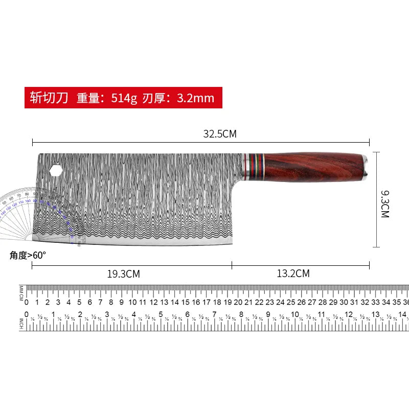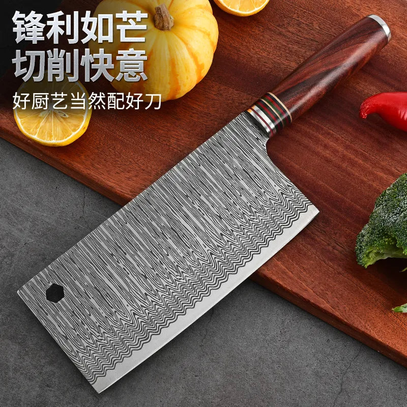 This hand-forged chef knife features 4Cr13 stainless steel with distinctive etched Damascus-style pattern. The red sandalwood handle provides excellent grip and durability for professional kitchen tasks. Perfect for chopping meat, slicing vegetables, and cutting fruits with precision and ease.