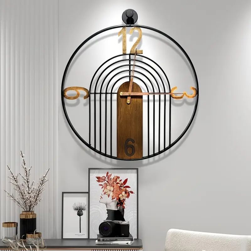 Large modern walnut dial wall clock with European industrial design and metal frame. Silent non-ticking quartz movement perfect for bedrooms, living rooms, kitchens, and studies. Handmade construction combines wood and metal aesthetics. Round iron styling adds sophisticated charm to dining room or restaurant spaces. Elegant home décor gift with timeless appeal.