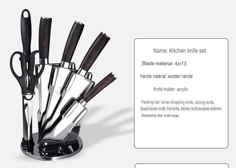 | Set Includes | Cleaver, Slicing Knife, Chef Knife, Fruit Knife, Scissors, Sharpening Rod, Rotating Stand |