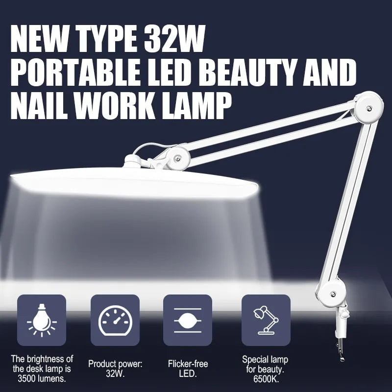 This professional 32W LED beauty work lamp features a flexible swing arm design for precise positioning during nail art and beauty procedures. The flicker-free LED technology provides 3500 lumens of bright, eye-friendly illumination with multiple dimming levels. Eco-friendly recyclable packaging and energy-efficient design make this lamp perfect for nail salons, eyelash extensions, and detailed beauty work.