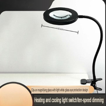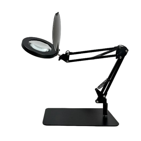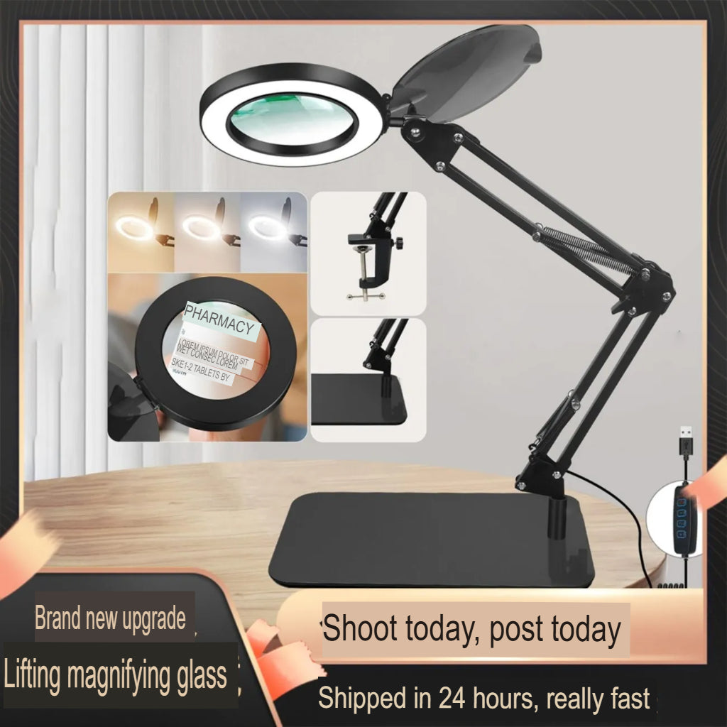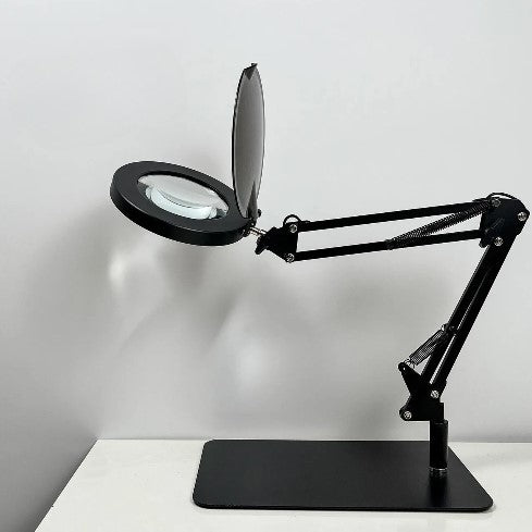 This professional magnifying desk lamp features adjustable brightness levels and multiple color temperature modes. The flexible swing arm design allows precise positioning for detailed work tasks. Perfect for electronics repair, crafting, reading, and precision work requiring enhanced visibility and magnification.