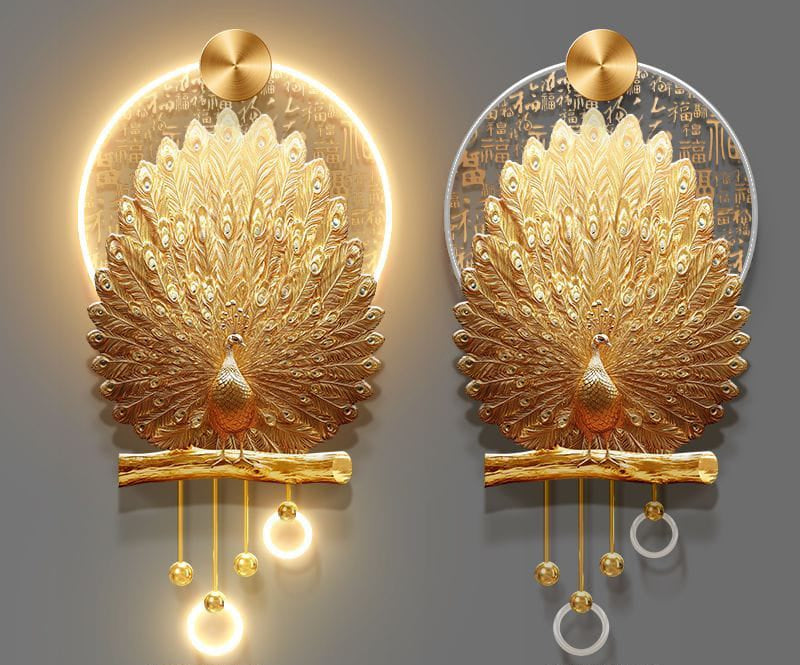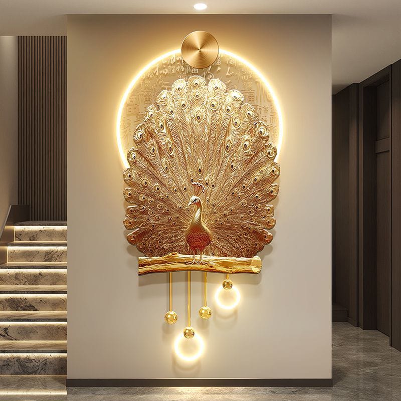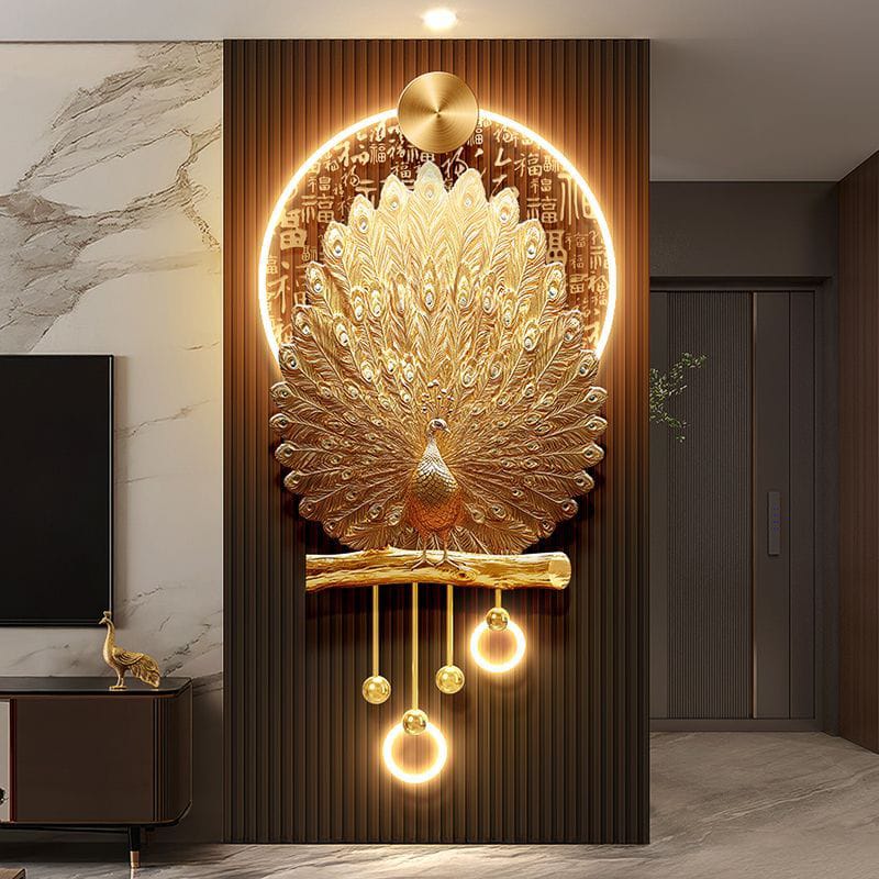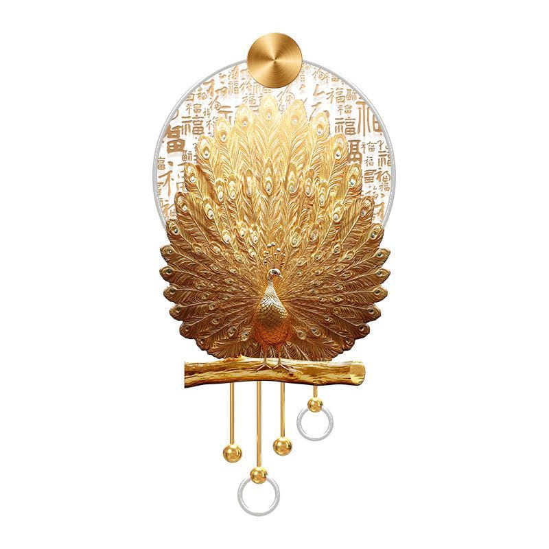 Luxurious Chinese-style gold peacock mural symbolizing hundred blessings and prosperity.