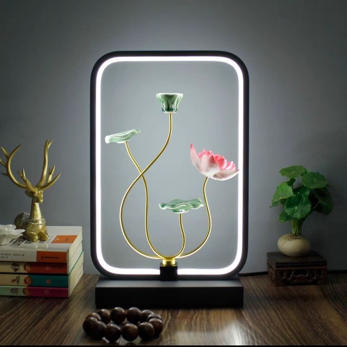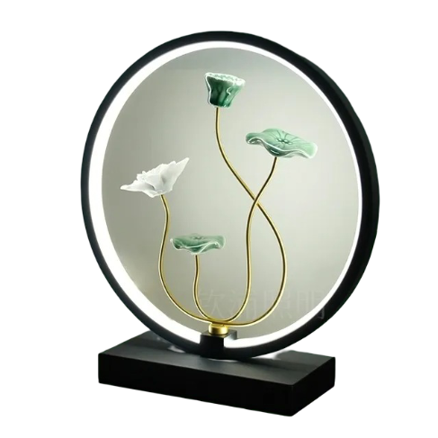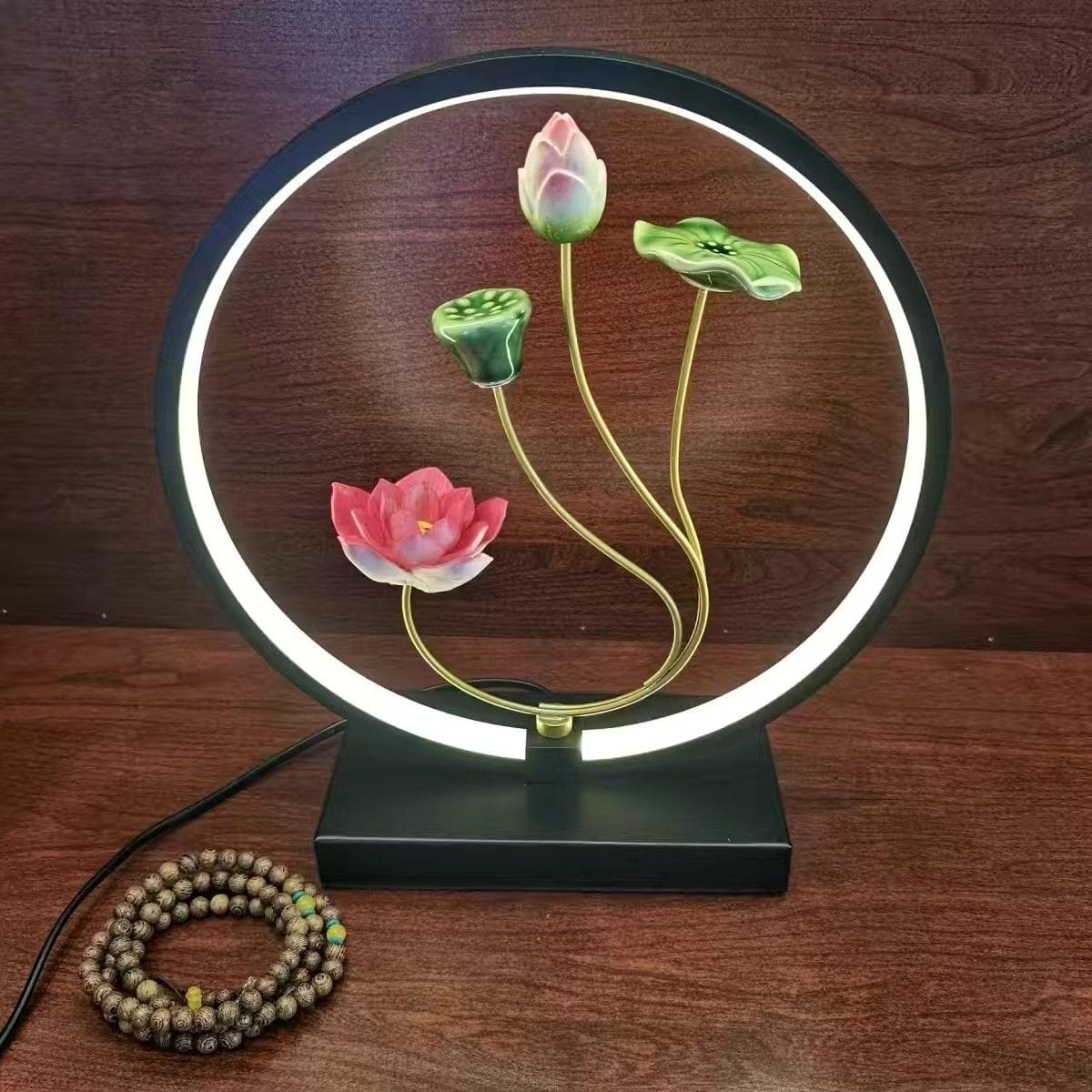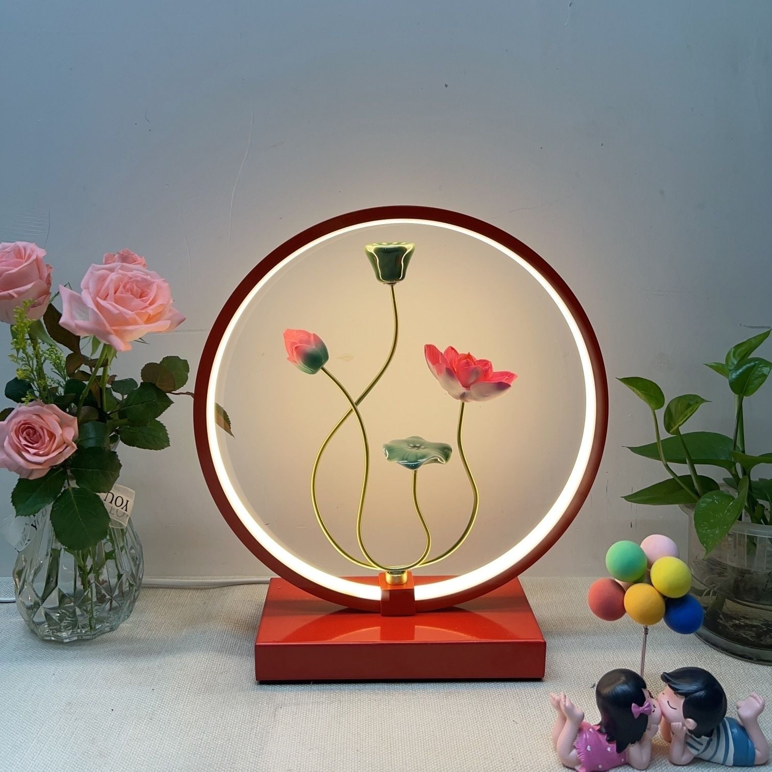 This elegant decorative table lamp features a modern Chinese design with ceramic lotus flowers and aluminum frame. With adjustable color temperature settings and remote control option, it creates perfect ambiance. The LED light source provides energy-efficient illumination ideal for bedrooms, living rooms, and study spaces.