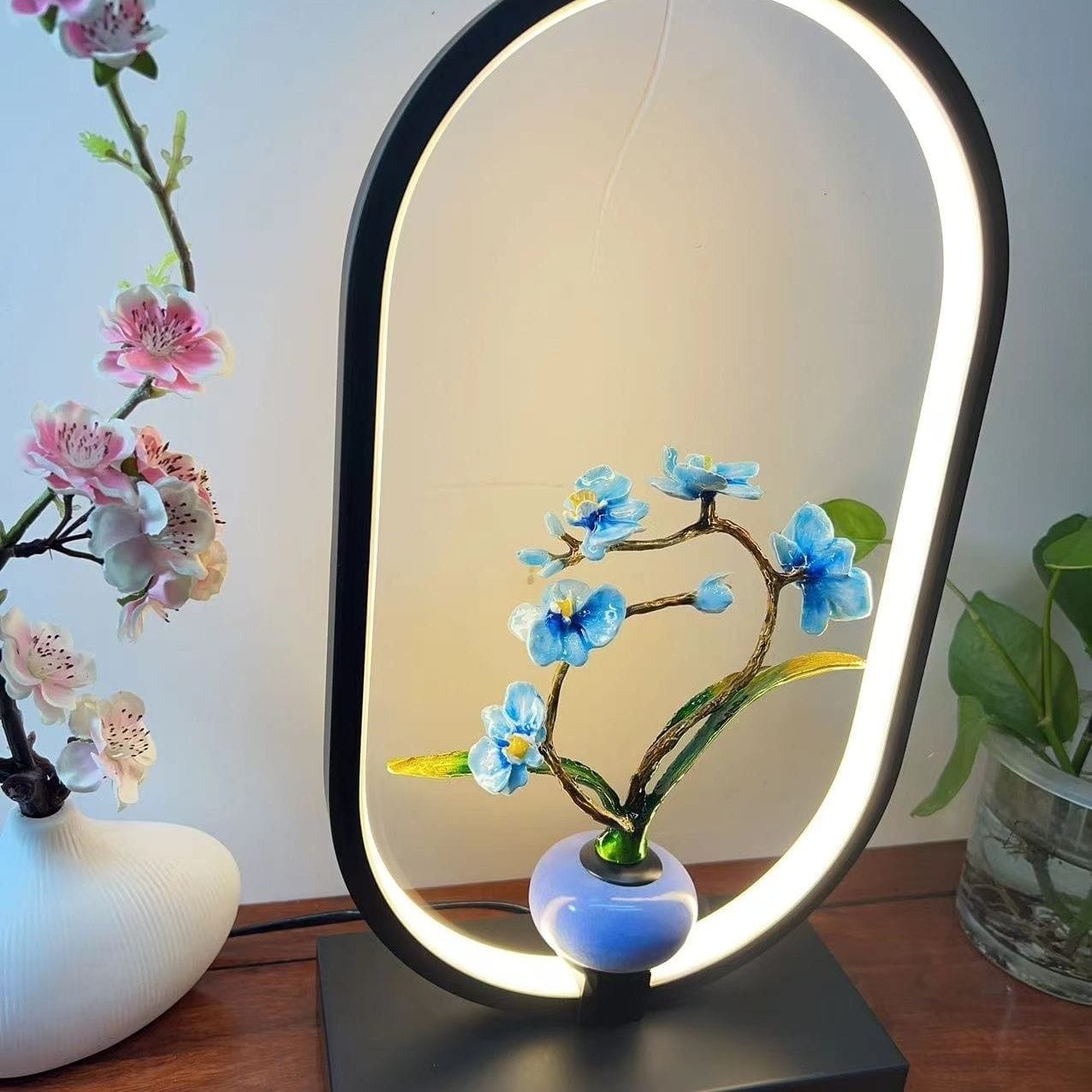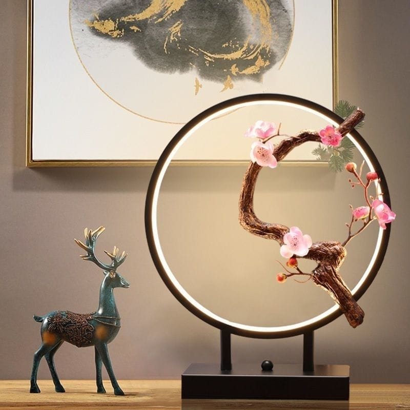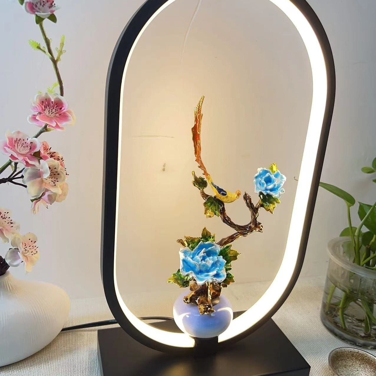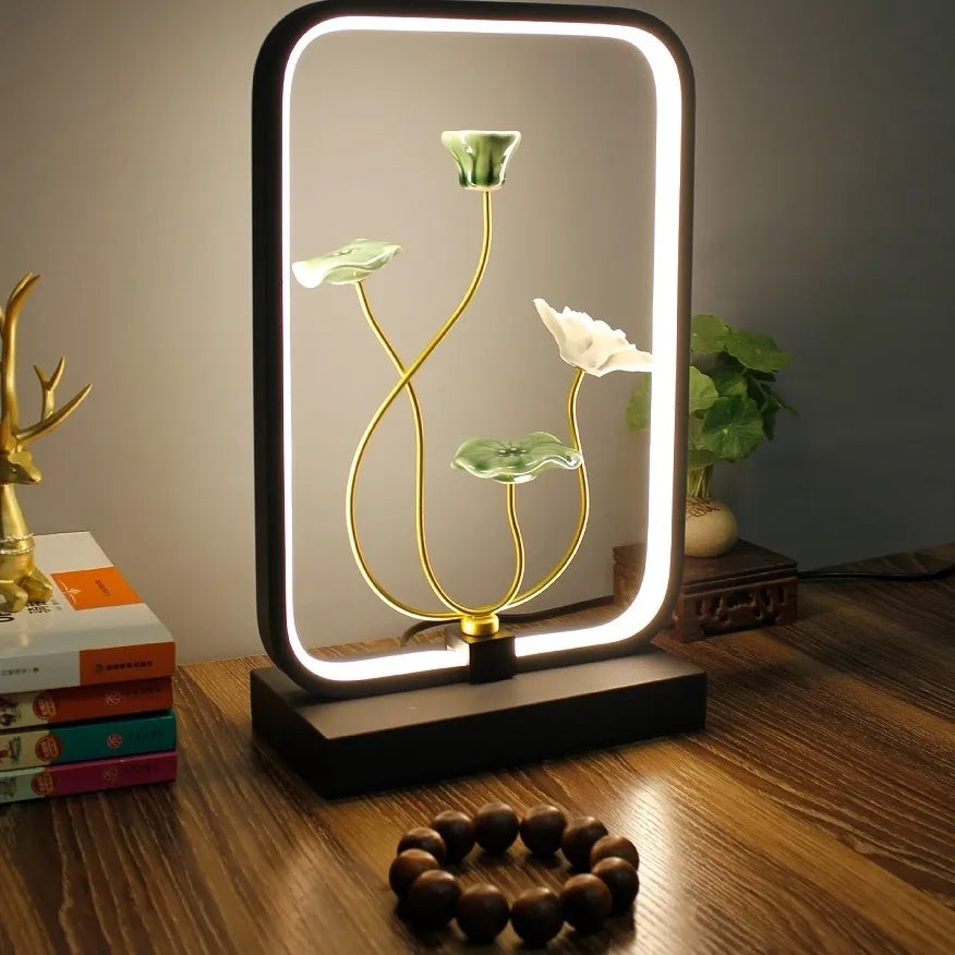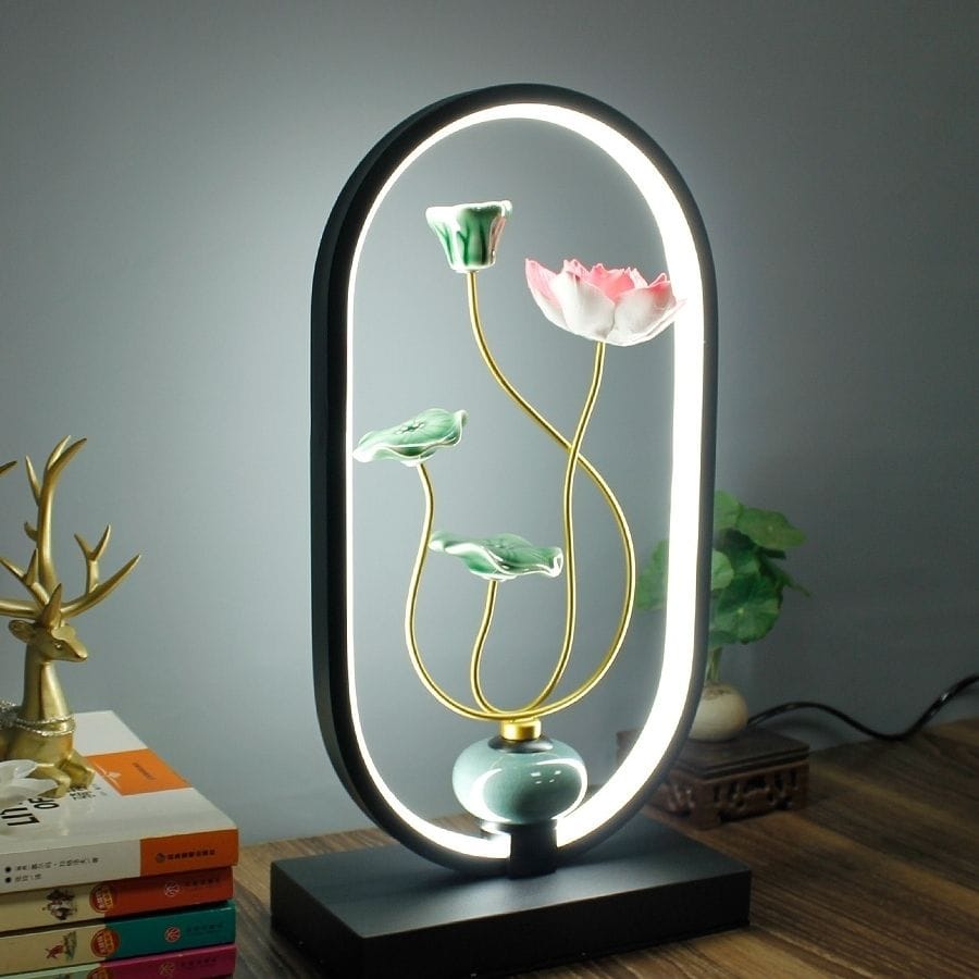 This elegant decorative table lamp features a modern Chinese design with ceramic lotus flowers and aluminum frame. With adjustable color temperature settings and remote control option, it creates perfect ambiance. The LED light source provides energy-efficient illumination ideal for bedrooms, living rooms, and study spaces.