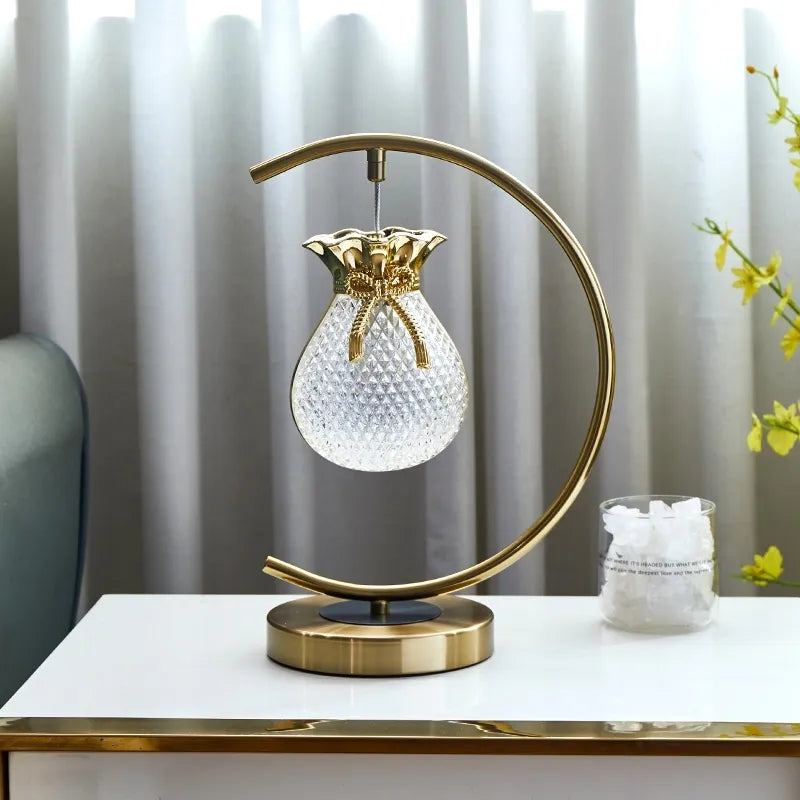 This elegant desk lamp features a classic pineapple-shaped glass shade with intricate embossed patterns, suspended from a graceful curved brass arm. The warm natural light creates a cozy ambiance perfect for bedrooms and study areas. With manual brightness adjustment and desktop mounting, this decorative lamp combines Western artistic style with functional lighting.