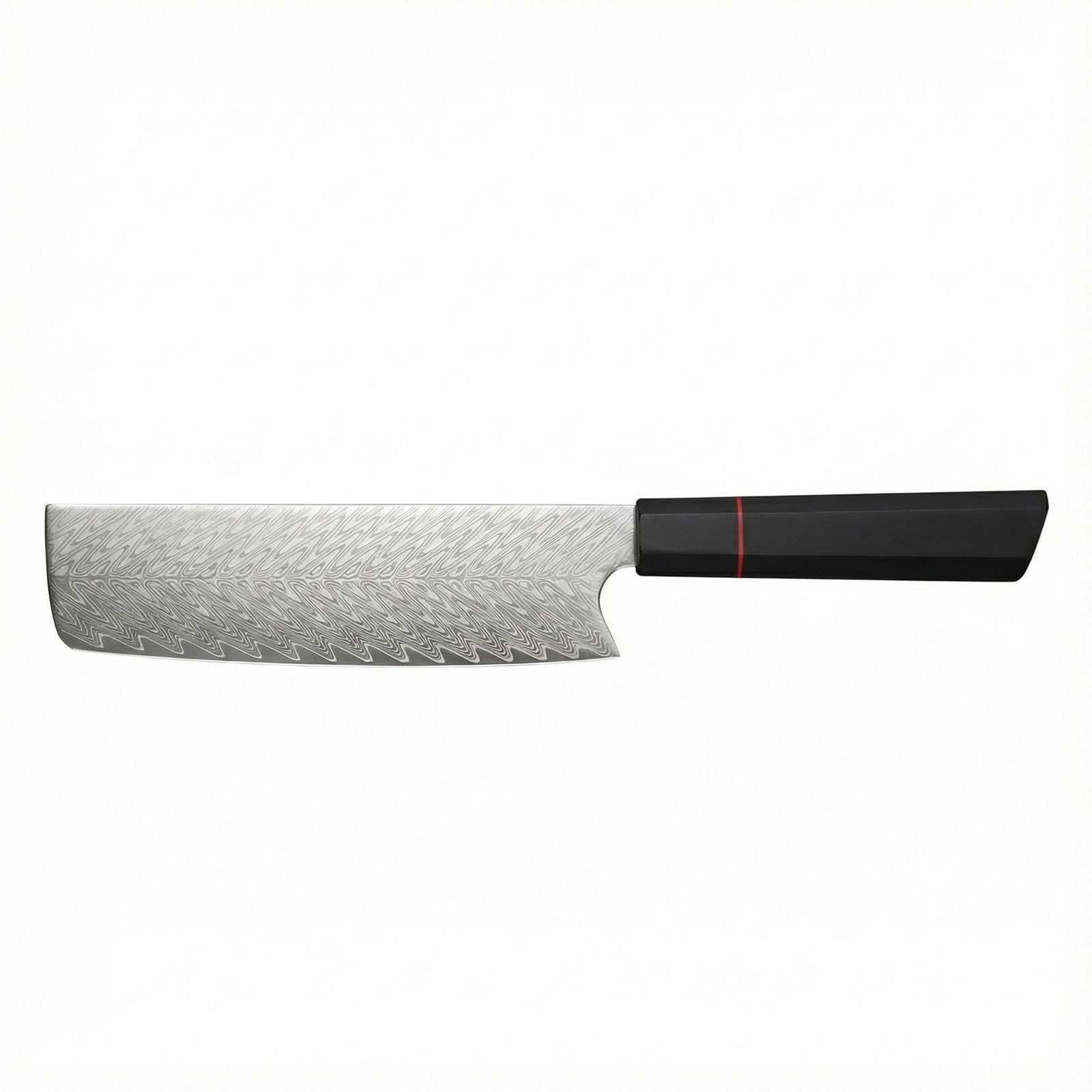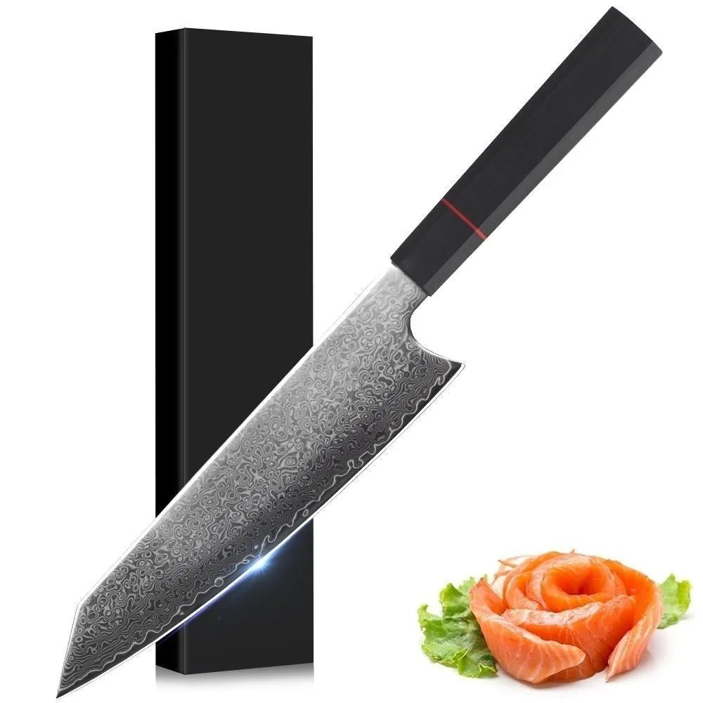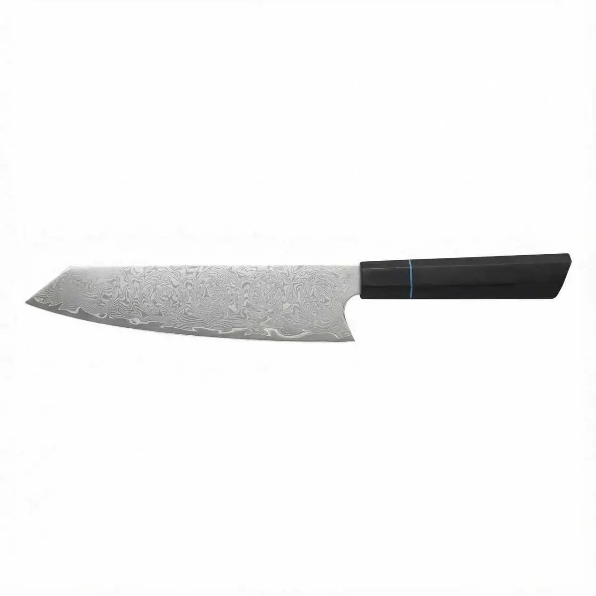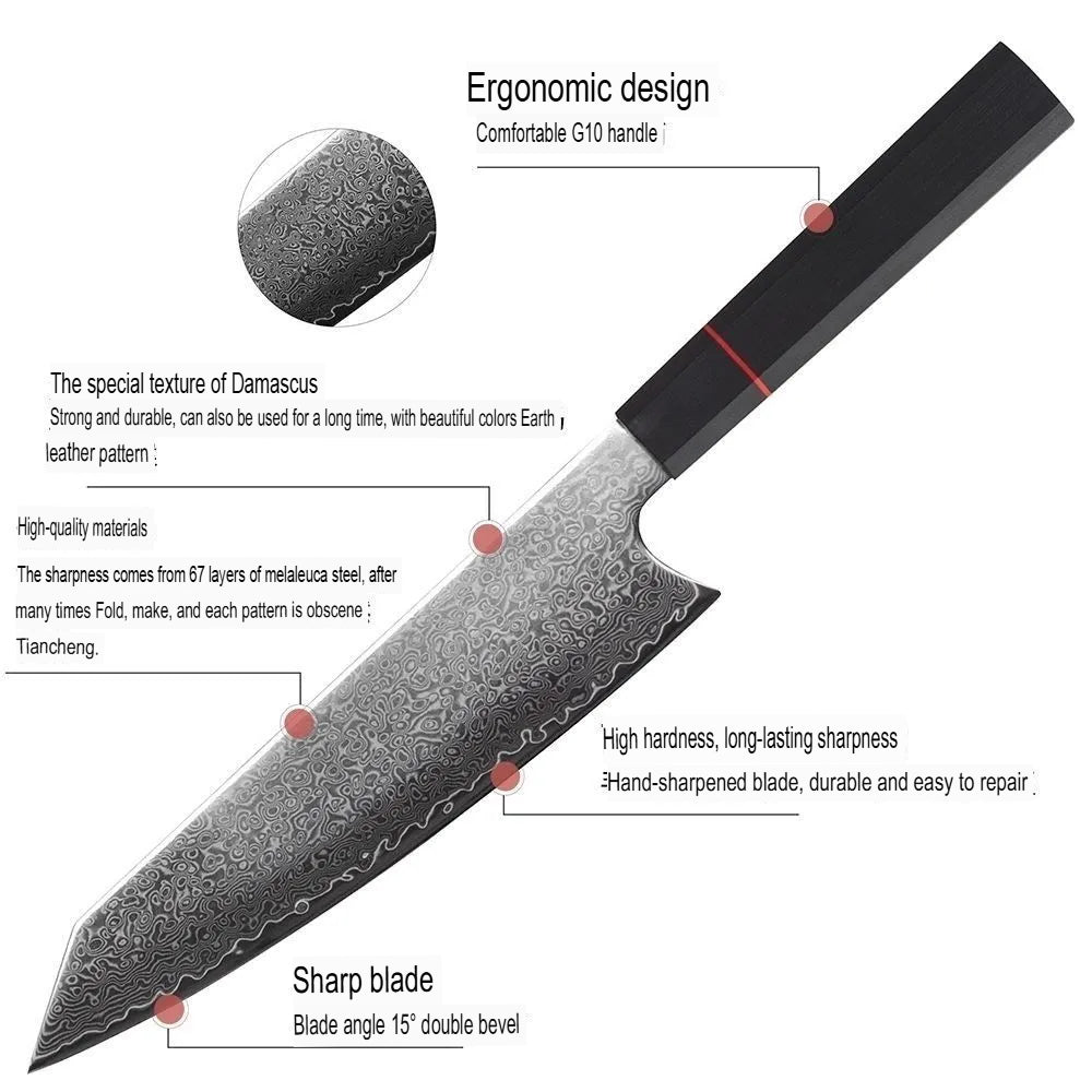 This professional-grade Damascus steel chef's knife features 67 layers for exceptional sharpness and durability. The ergonomic G10 handle ensures comfortable grip and precise control during food preparation. Perfect for slicing vegetables, meats, fish, and bread with effortless precision.
