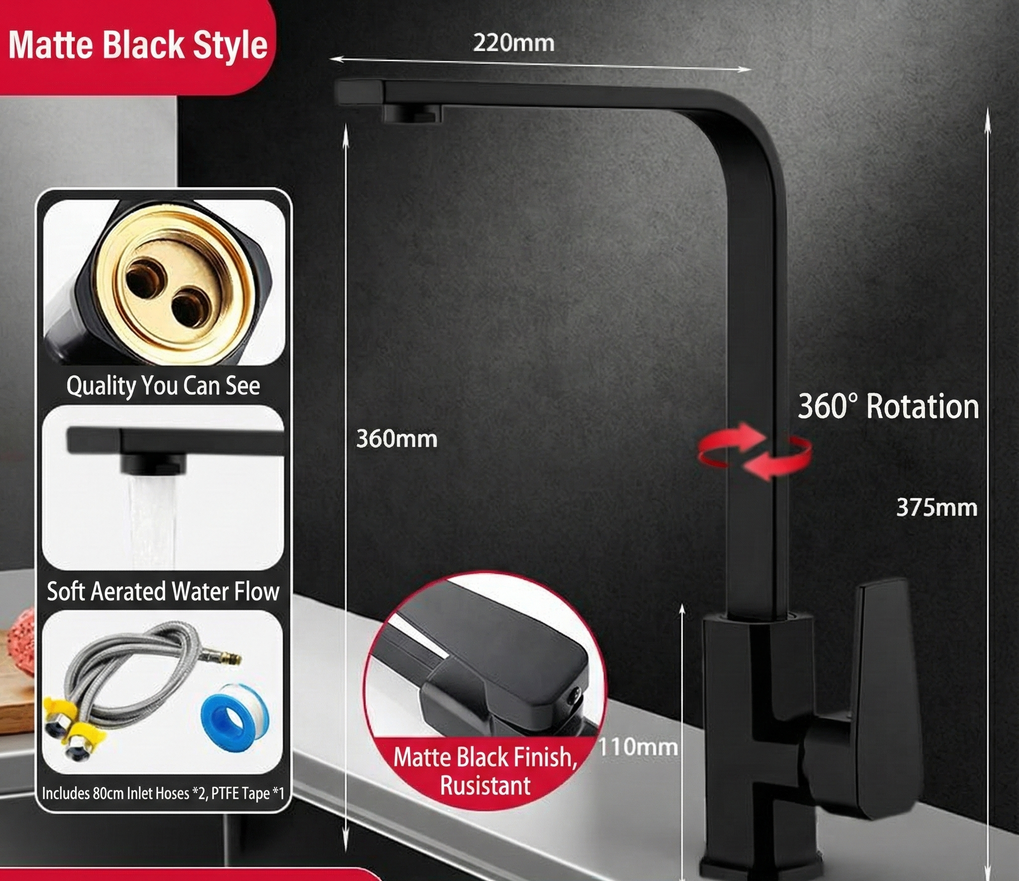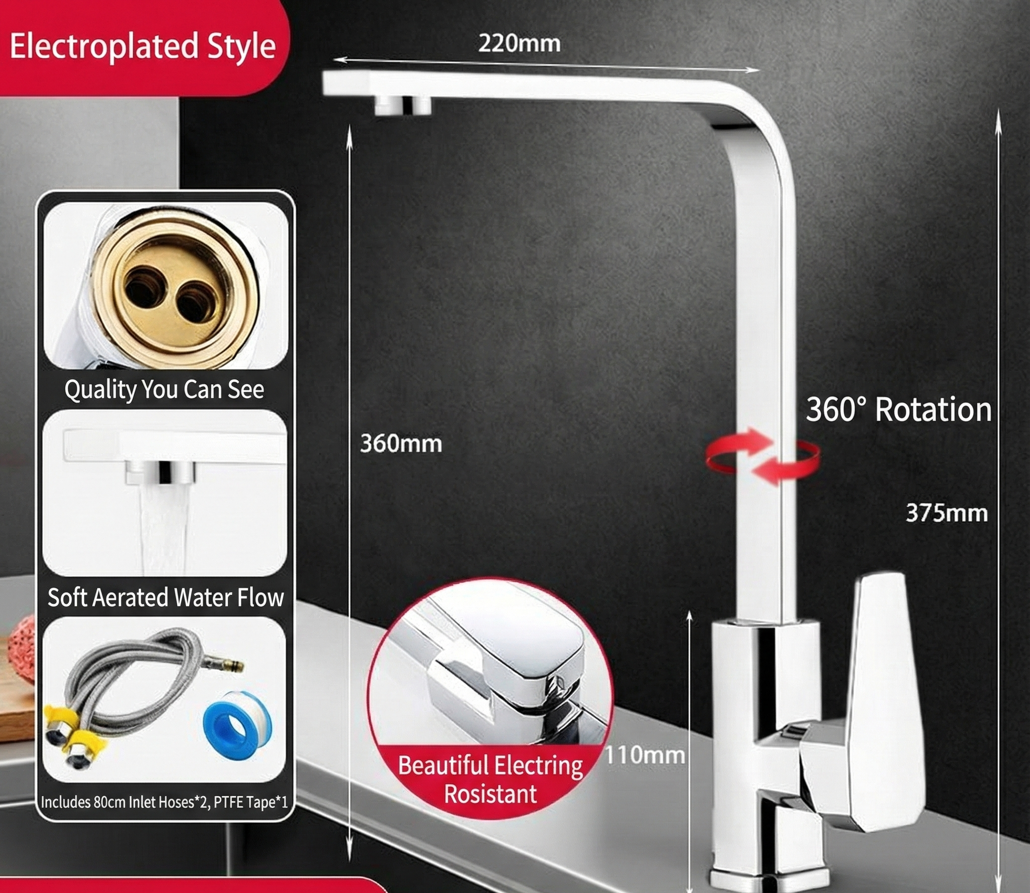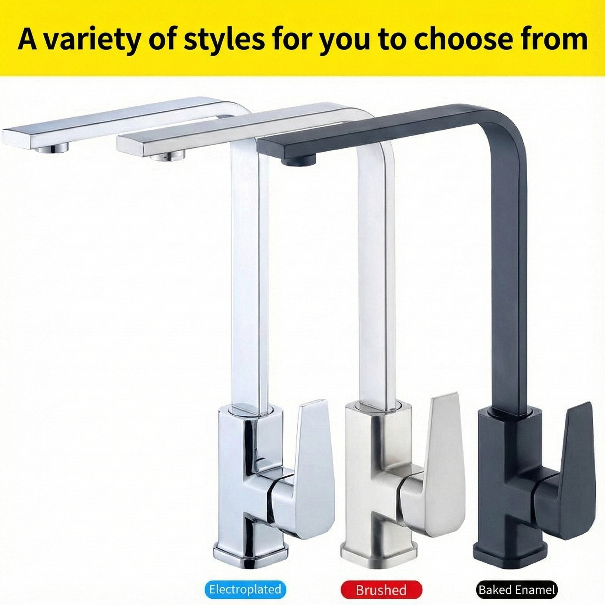 Upgrade your kitchen with our sleek square stainless steel faucet featuring ceramic disc valve technology and 360° rotation capability. Perfect for both sink and vegetable basin applications with hot and cold water control. Chrome plating ensures durability while single-handle design provides convenient daily operation.