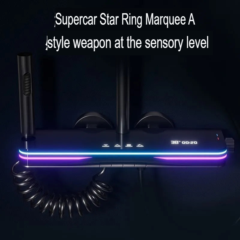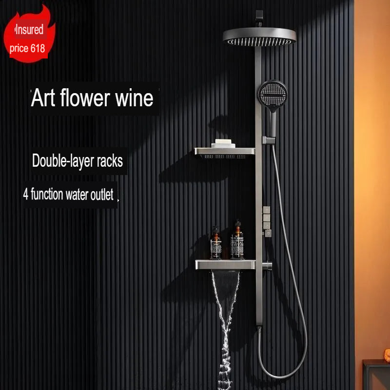 This elegant white shower system features advanced thermostatic control with pressurized spray for consistent water temperature and flow. Multi-functional design includes overhead rain shower, back spray jets, handheld shower, and dual storage shelves. Perfect for modern bathrooms seeking both style and practical organization with water-efficient Level 3 rating.