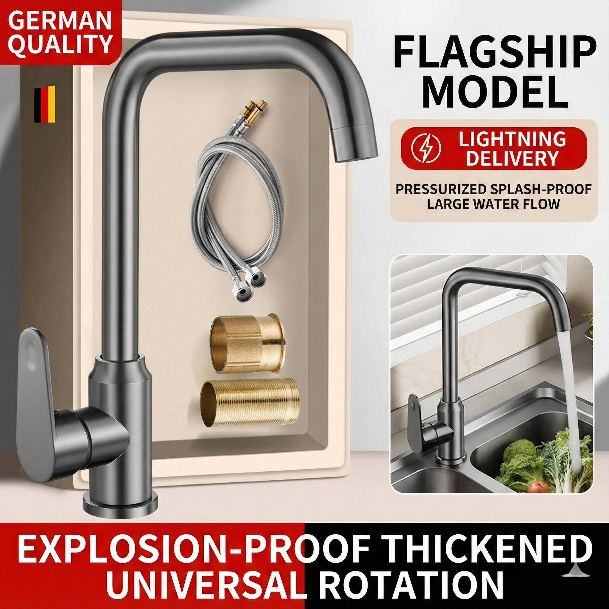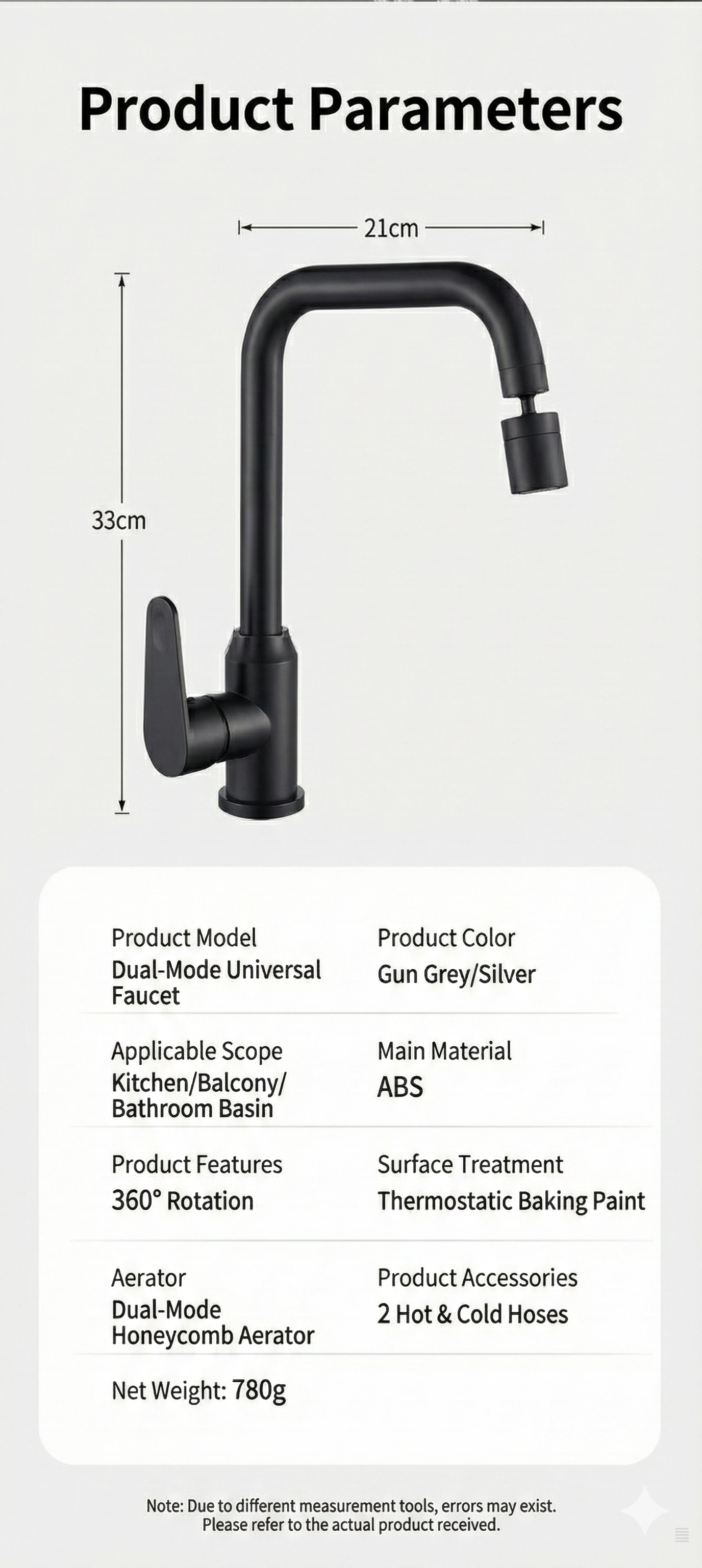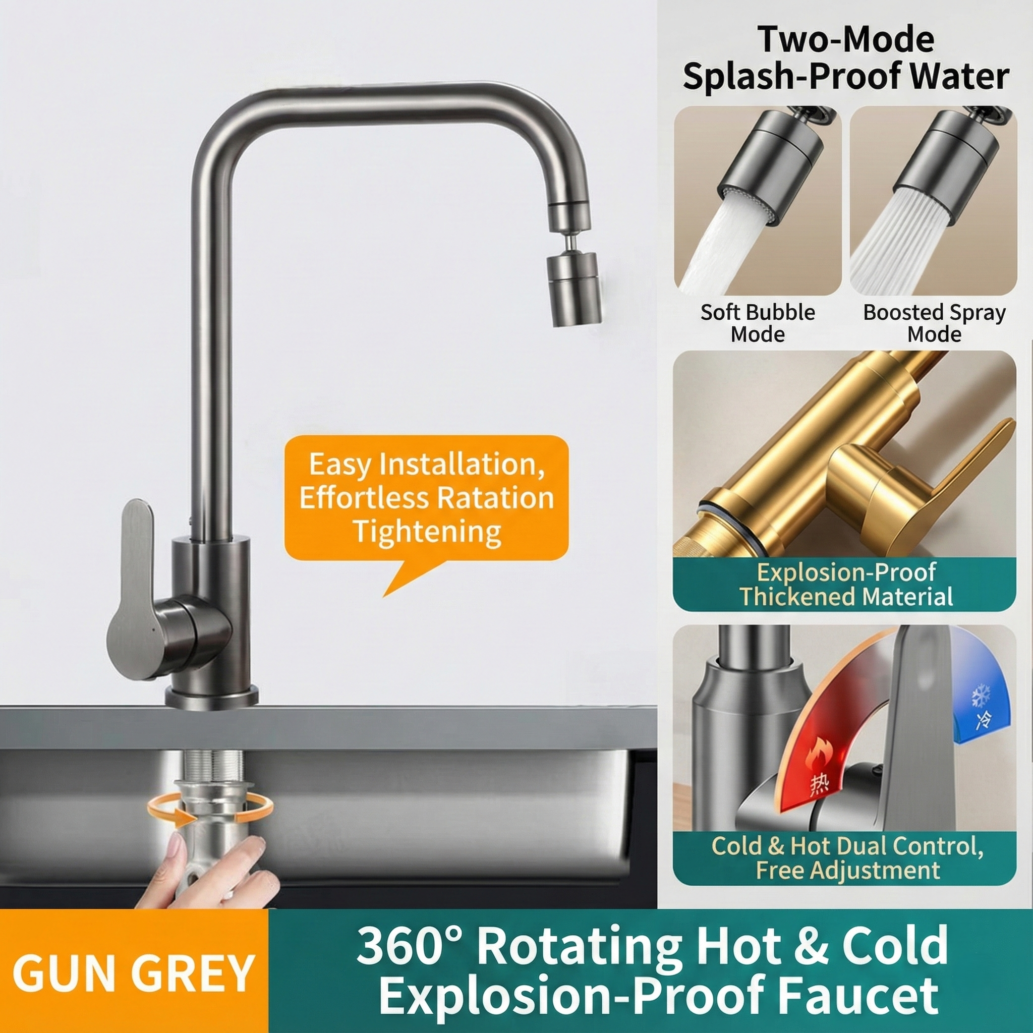Premium thickened kitchen faucet featuring dual hot and cold water control with omnidirectional 360-degree rotation. Combines 201 stainless steel durability with ceramic disc valve reliability and two-stage honeycomb aerator for superior water flow. Ideal for kitchens, bathrooms, and balconies with elegant gunmetal gray finish and included connection hoses.